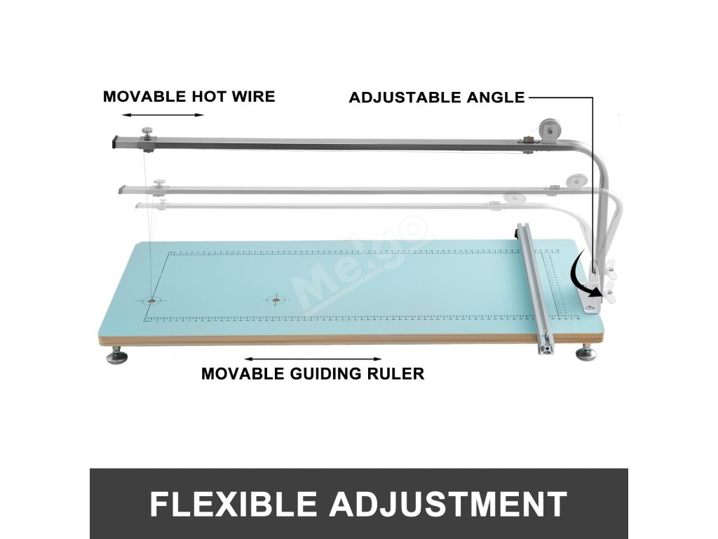 Uhol stĺpika a ohrievacieho drôtu a polohu vodiaceho pravítka možno ľubovoľne nastaviť podľa požiadaviek na rezanie.