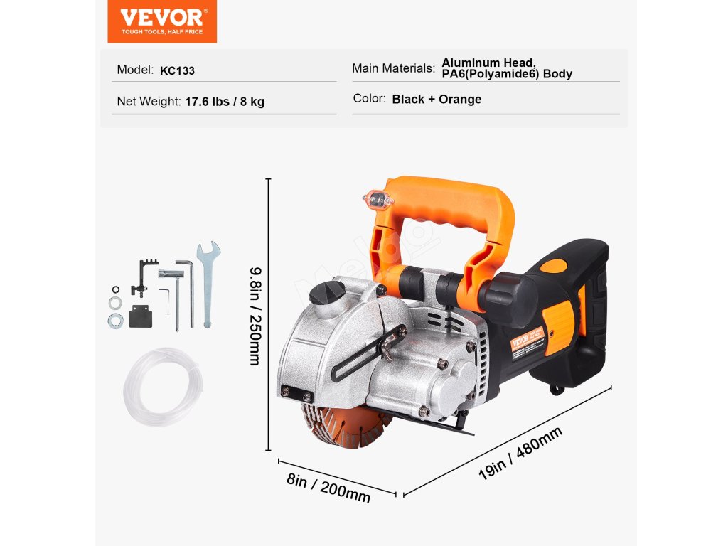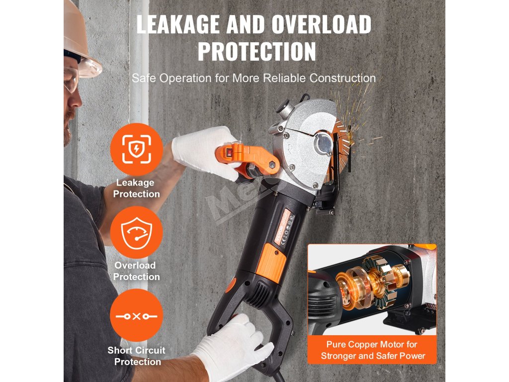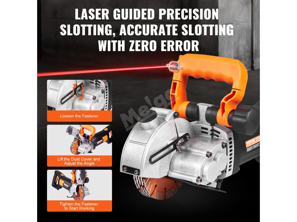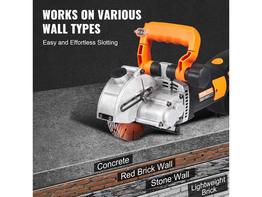 Stroj na rezanie drážok do stien je vhodný na domáce a priemyselné použitie a je skvelý na rezanie betónových stien, mramoru, žuly, červených tehál a ocele. Kovový protiprachový kryt a plastový plášť sú odolné a pevné pre dlhú životnosť. Náš stroj je vhodný na rýchle rezanie stenových drážok naraz bez použitia iných nástrojov. Hĺbku a šírku reznej drážky možno ľahko nastaviť.