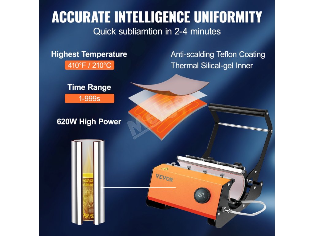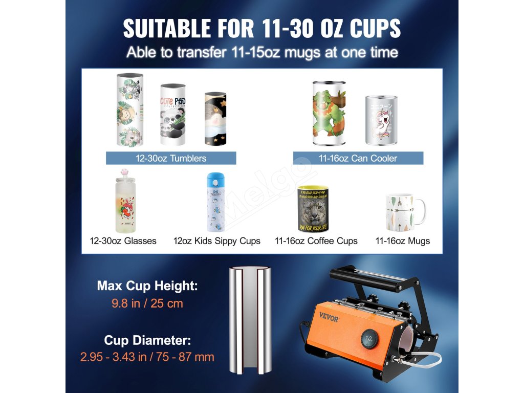 kapacita 30oz umožňuje lisovanie 2 šálok naraz pre rôzne veľkosti šálok, ako sú vysoké hliníkové fľaše, poháre na víno, poháre, hrnčeky na kávu atď. Tento odnímateľný sublimačný lis na hrnčeky podporuje aj ohrievacie podložky iných veľkostí, ktoré sú k dispozícii samostatne.