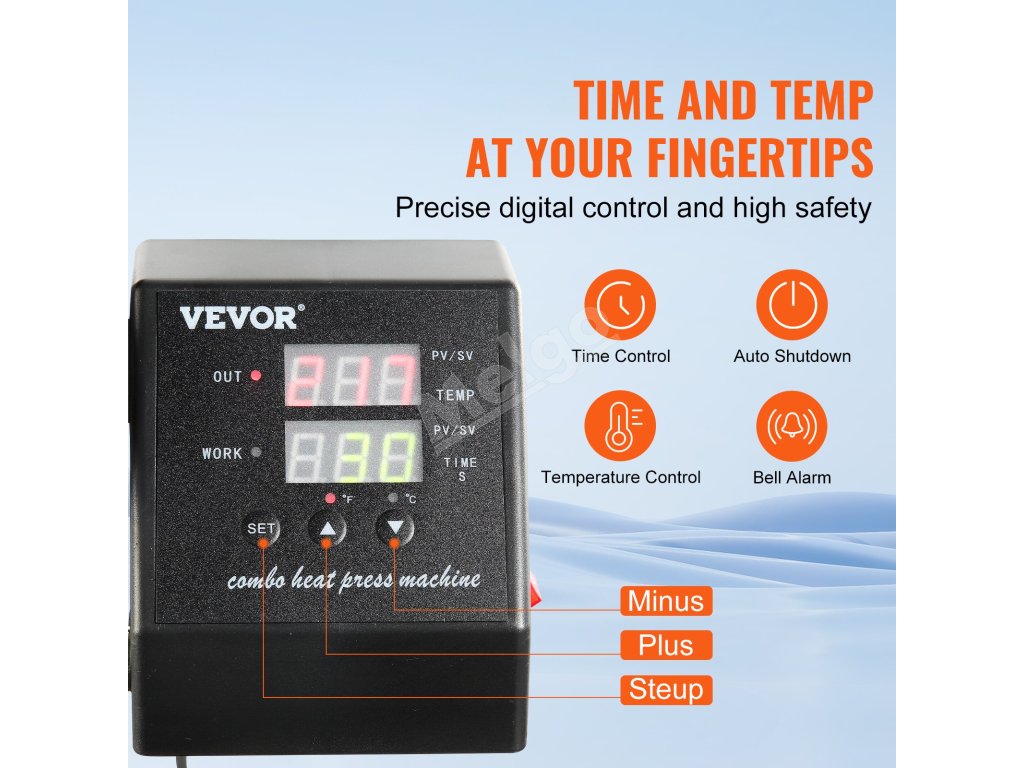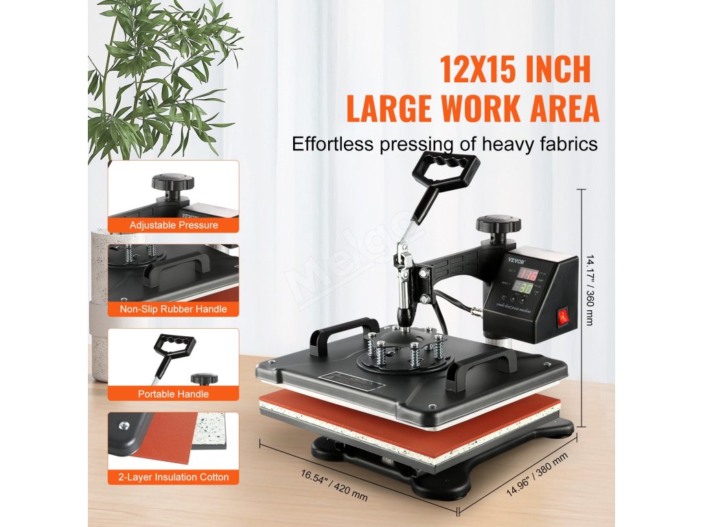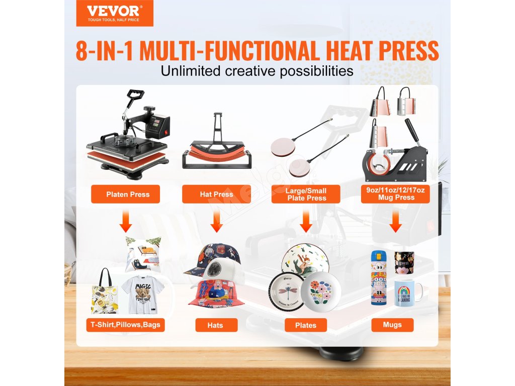 Tento tepelný lis využíva najnovšiu dvojvrstvovú izolačnú technológiu na zlepšenie výkonu prenosu. Vďaka presnému zariadeniu na reguláciu teploty sa ešte viac zvýšila stabilita. K dispozícii bude všetko príslušenstvo, ktoré vám prinesie krásnu grafiku na tričkách, čiapkach, tanieroch, šálkach atď.