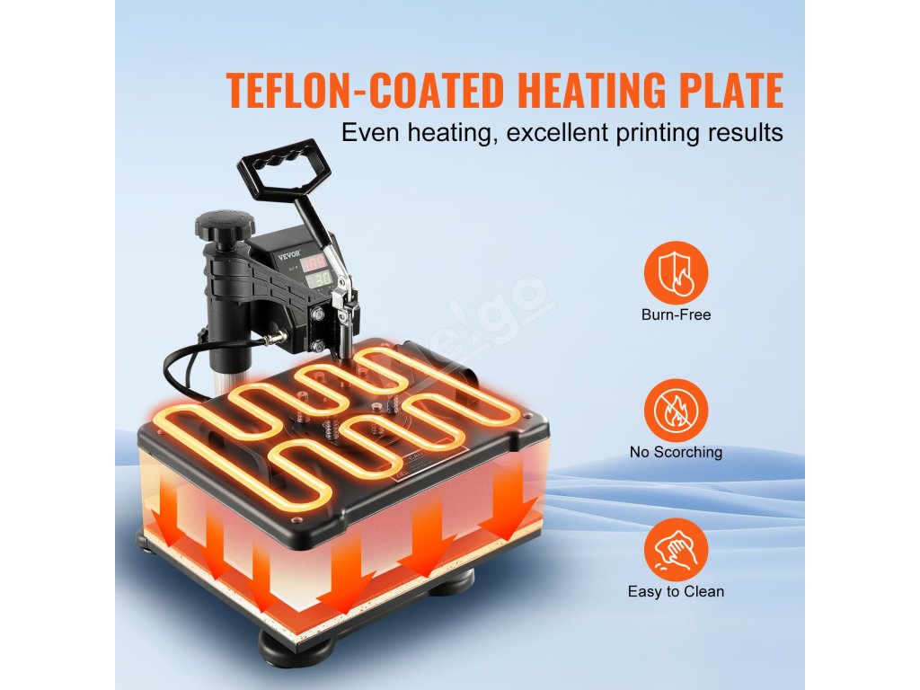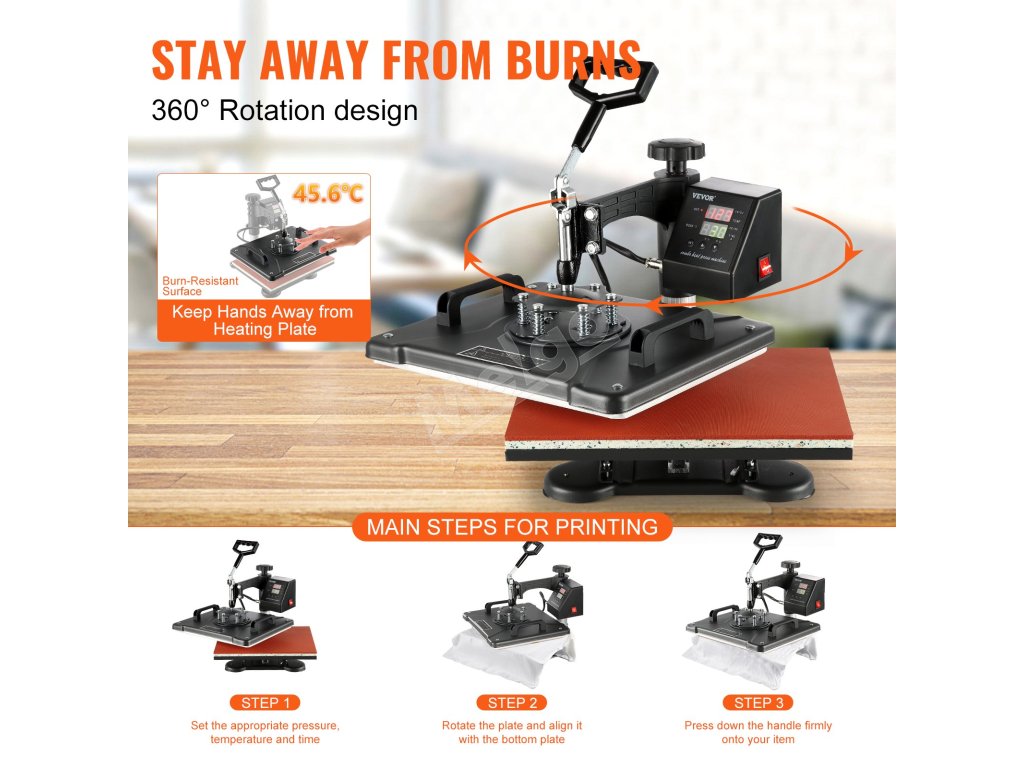 Prenosná rukoväť môže uľahčiť pohyb. Flexibilným tlačidlom sa dá ľahko nastaviť výška. Na základe pevnej základne si tepelný lis vyžaduje stabilnú oporu, aby sa zachoval hladký chod.