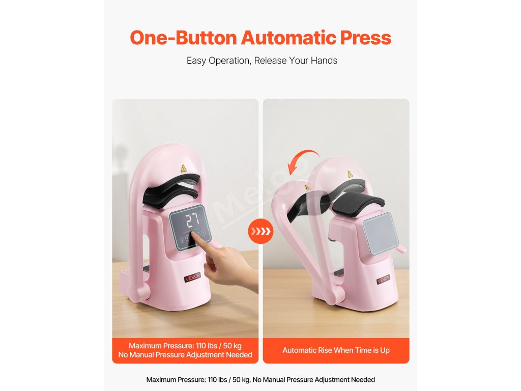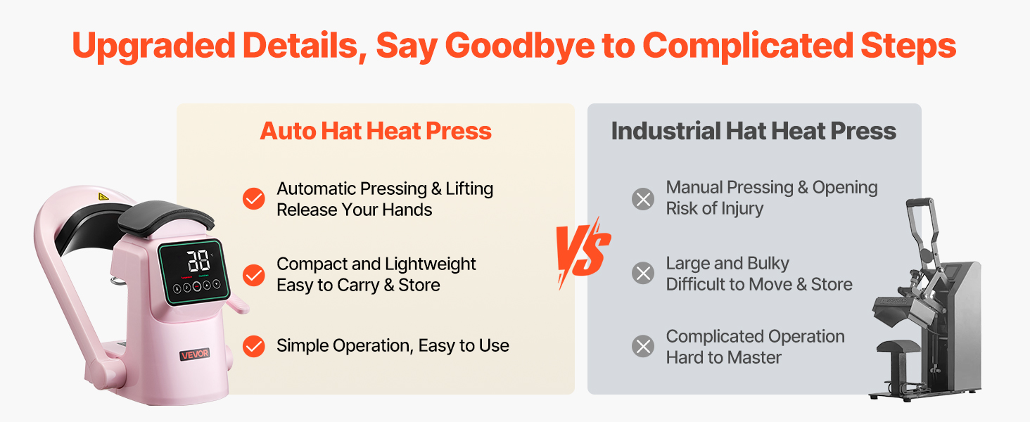 Vďaka automatickému zdvihu platne jedným dotykom je ovládanie jednoduché a intuitívne, ideálne na prenosné použitie a ľahké skladovanie. Na rozdiel od tradičných priemyselných tepelných lisov, ktoré vyžadujú manuálne lisovanie - hrozí namáhanie rúk a vyžadujú si objemné nastavenia - náš tepelný lis na čiapky poskytuje efektívny výkon bez námahy.