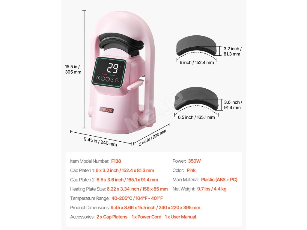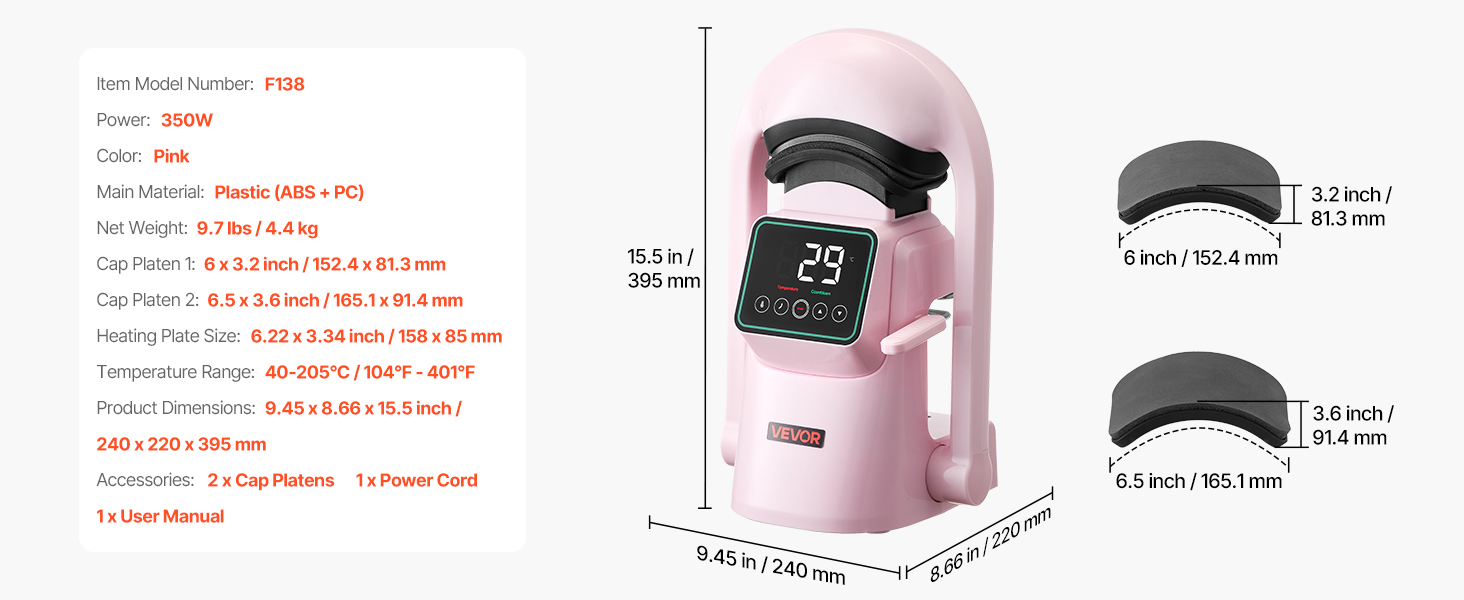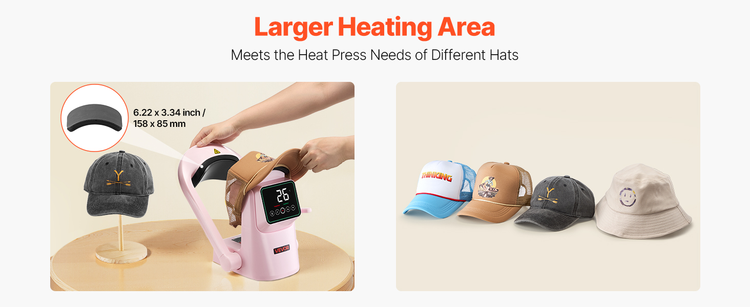 Tento automatický lis na klobúky je vybavený veľkorysou vyhrievacou platňou s rozmermi 6 x 3,54 palca, ktorá sa ľahko prispôsobí oblasti prenosu na akomkoľvek klobúku. Od bejzbalových čiapok až po baretky - zakaždým dosiahnete presné a živé výtlačky, ktoré splnia všetky vaše potreby v oblasti DIY prispôsobenia.