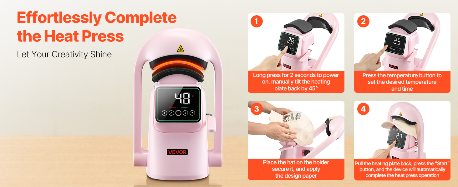 Dokončite svoju prácu s tepelným lisom len v štyroch jednoduchých krokoch. Tento tepelný lis na klobúky určený pre začiatočníkov aj profesionálov vám umožní v krátkom čase uviesť do života vaše kreatívne nápady.