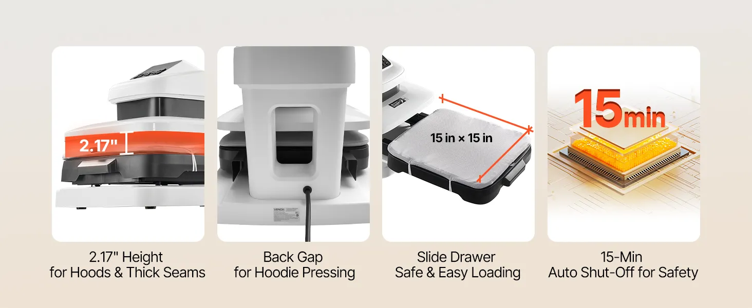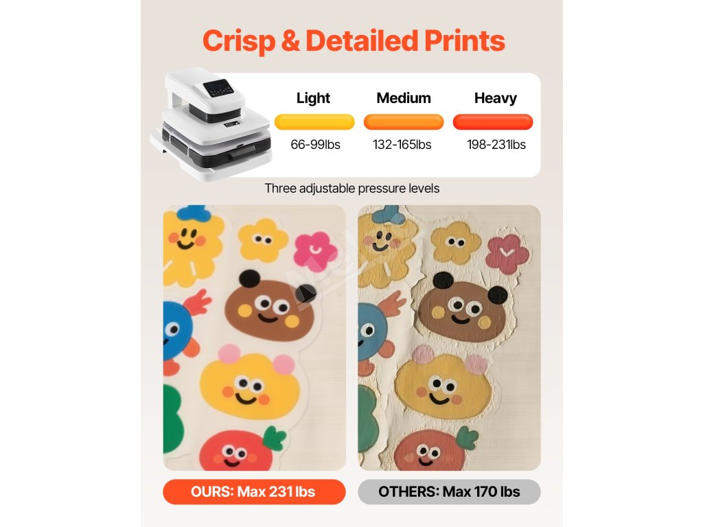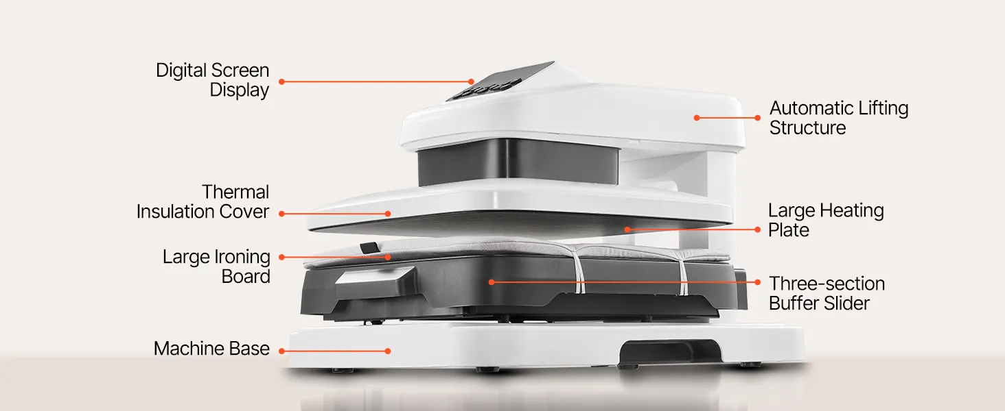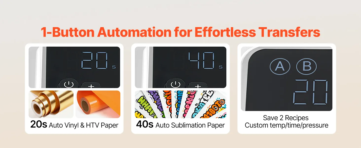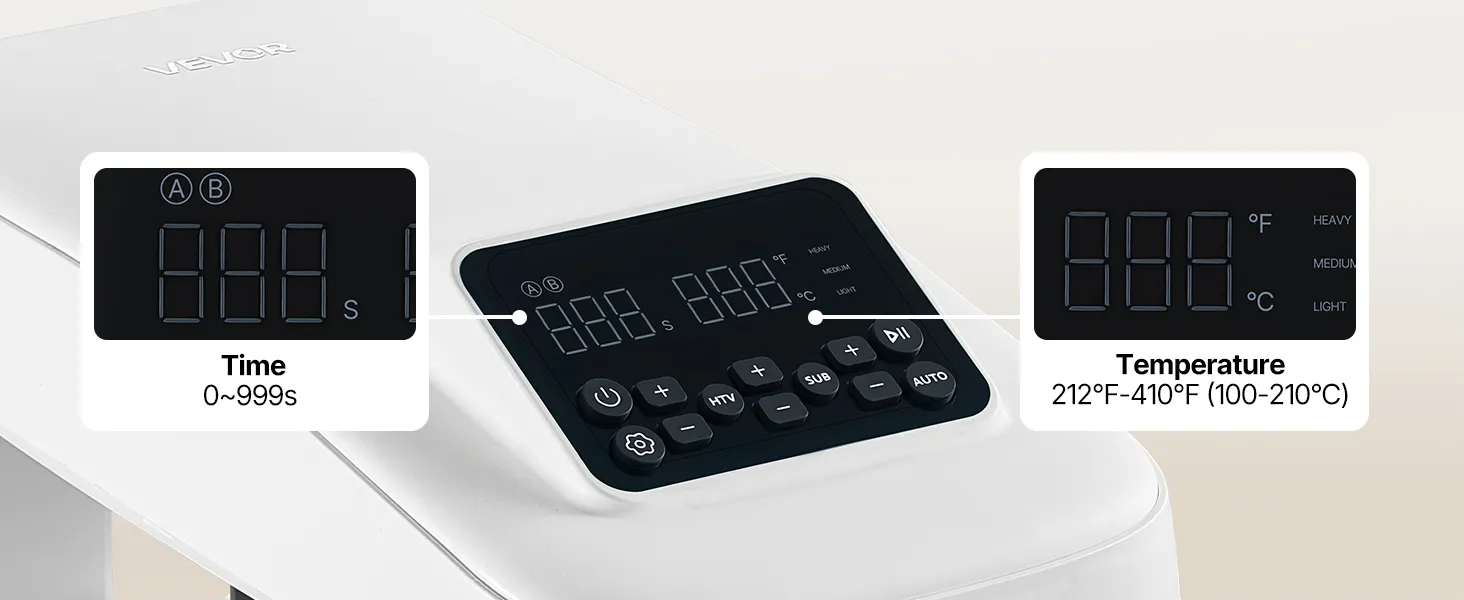 Digitálny displej umožňuje prepínanie medzi stupňami Celzia a Fahrenheita jedným dotykom, vďaka čomu je automatický tepelný lis vhodný na každodenné používanie. Presne zobrazuje teploty v reálnom čase - už žiadne problémy s prevodom jednotiek, len intuitívne a efektívne ovládanie.