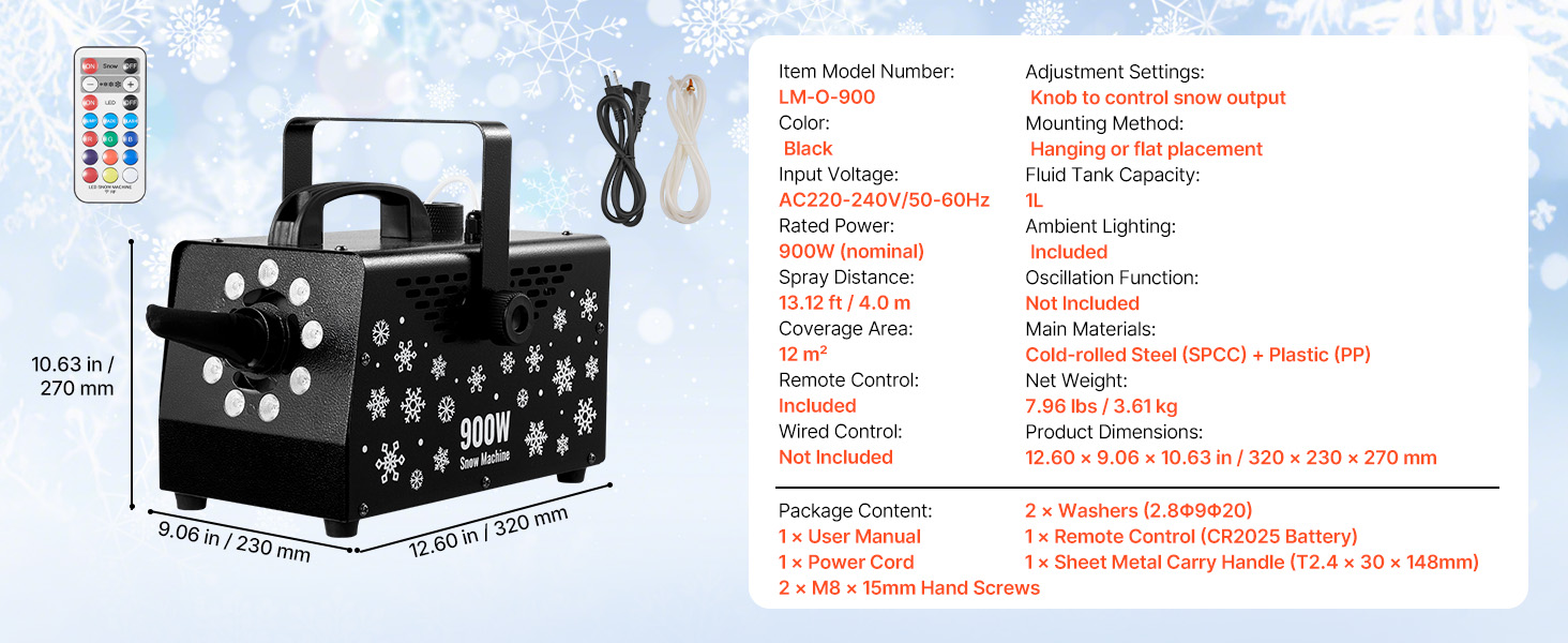 Tento 900W snežný stroj sa dodáva s 1L nádržou na predĺžený výkon snehu. Rozprašuje až do vzdialenosti 13,12 ft / 4,0 m a pokrýva približne 12㎡ realistickou penou pripomínajúcou sneh. Vďaka bezdrôtovému diaľkovému ovládaniu a ovládaciemu gombíku ľahko ovláda objem snehu a rýchlosť. Zabudované 12-farebné LED svetlá dodávajú dynamický vizuálny efekt.