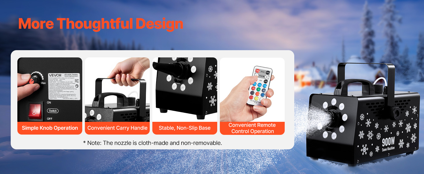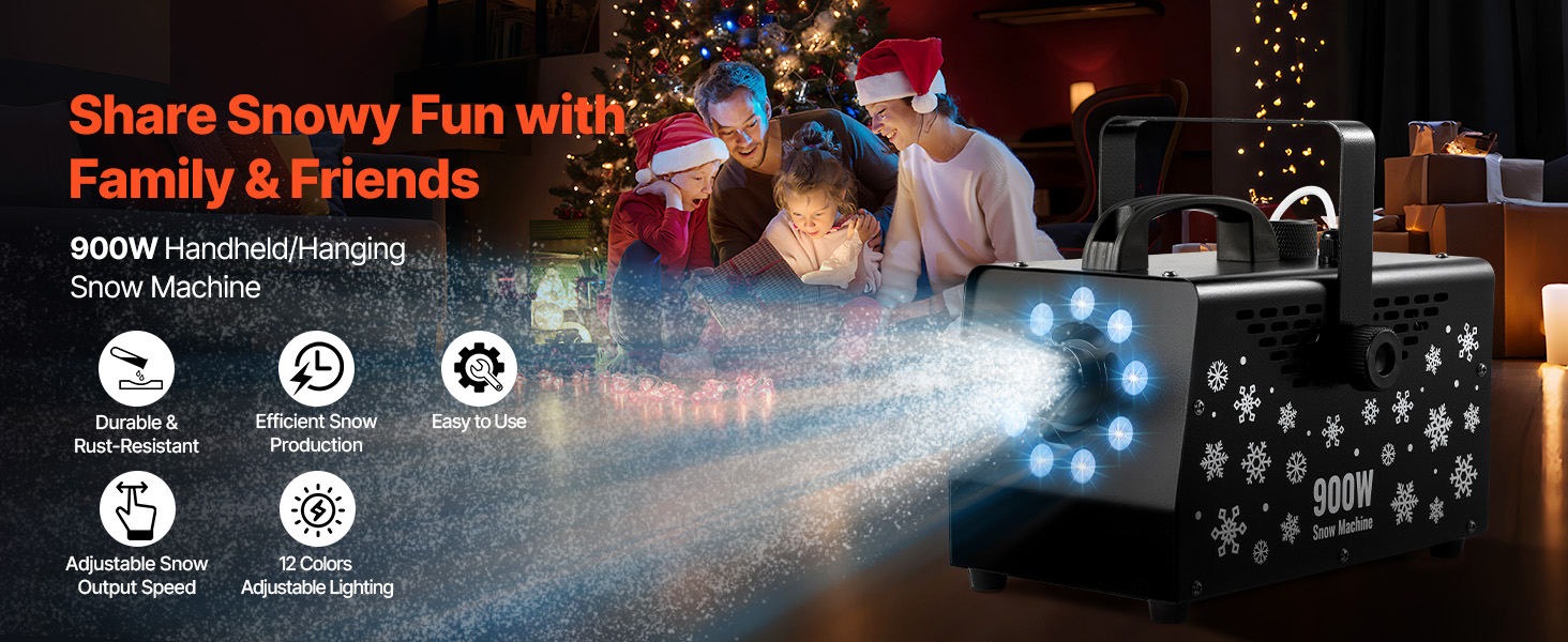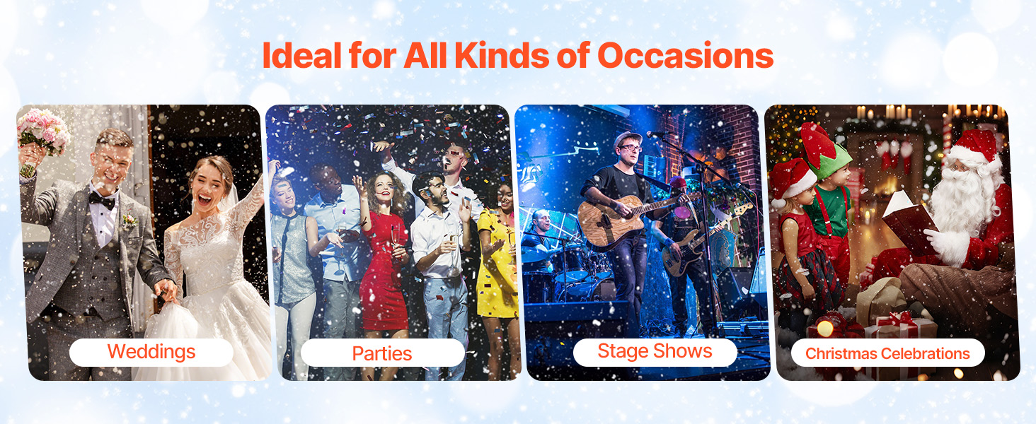 Tento výrobník snehu okamžite premení akýkoľvek priestor na zasneženú snovú krajinu - od svadieb a dovolenkového fotografovania až po vianočné večierky a komerčné výstavy. Skvelá voľba na posilnenie sviatočnej atmosféry a vytvorenie nezabudnuteľných vizuálnych efektov.