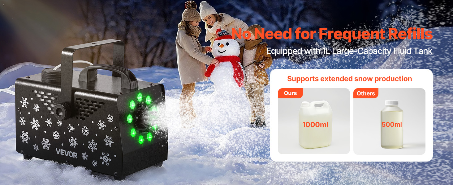 Tento stroj na výrobu umelého snehu, vybavený zabudovanou nádržou na tekutinu s objemom 1 l, podporuje nepretržitú výrobu snehu - nie je potrebné ho často dopĺňať. Či už ide o večierky, pódiové zostavy alebo dlhé podujatia, budete si môcť vychutnať neprerušované sneženie pre väčší zážitok.