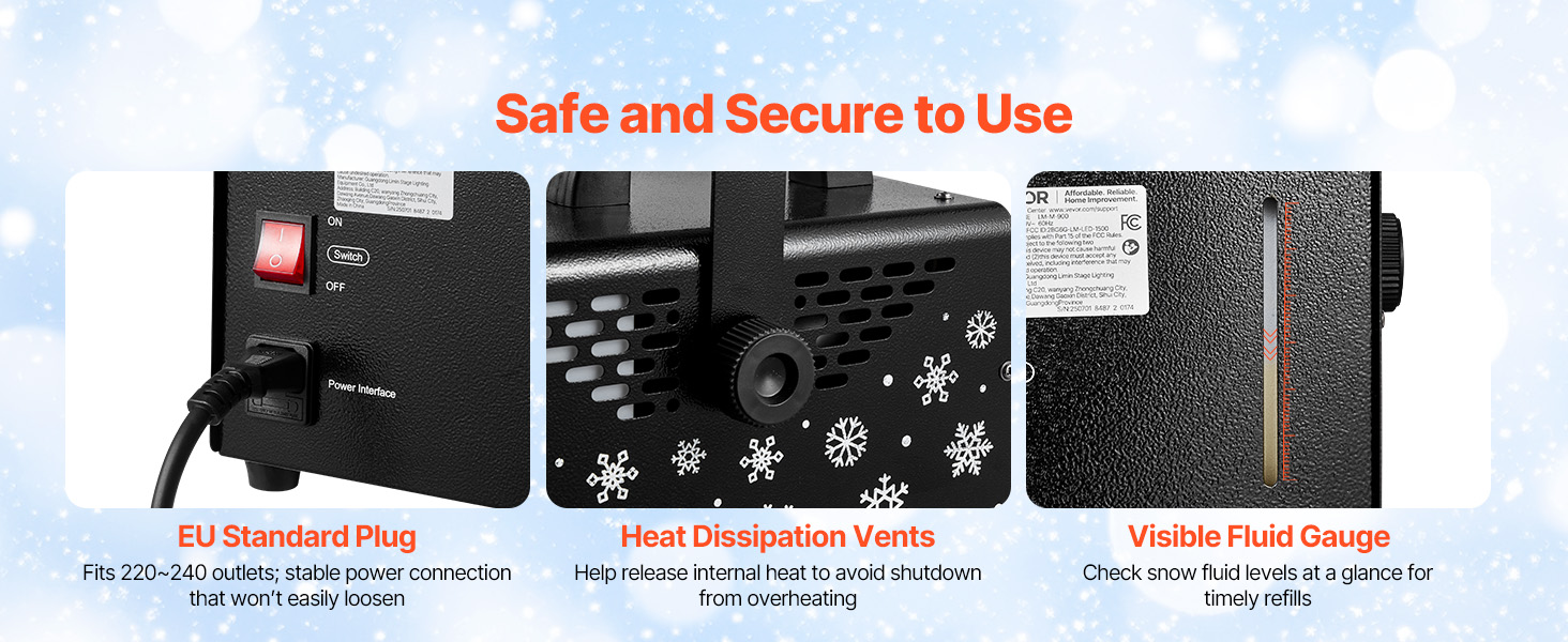 Uzemnená zástrčka zabezpečuje stabilné napájanie, zatiaľ čo viaceré otvory na odvod tepla pomáhajú predĺžiť životnosť snežného stroja. Prehľadný ukazovateľ hladiny kvapaliny vám umožní jednoducho sledovať zostávajúcu snehovú kvapalinu, čím sa predíde prevádzke na sucho a neočakávaným vypnutiam pre väčší pokoj.