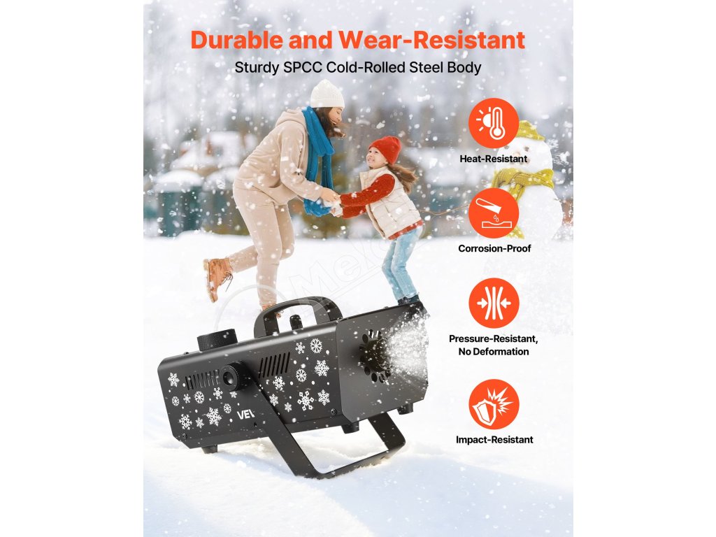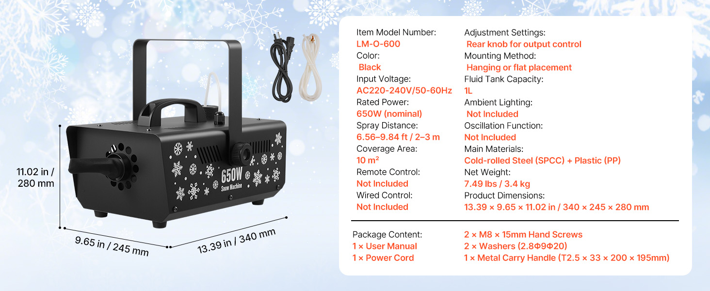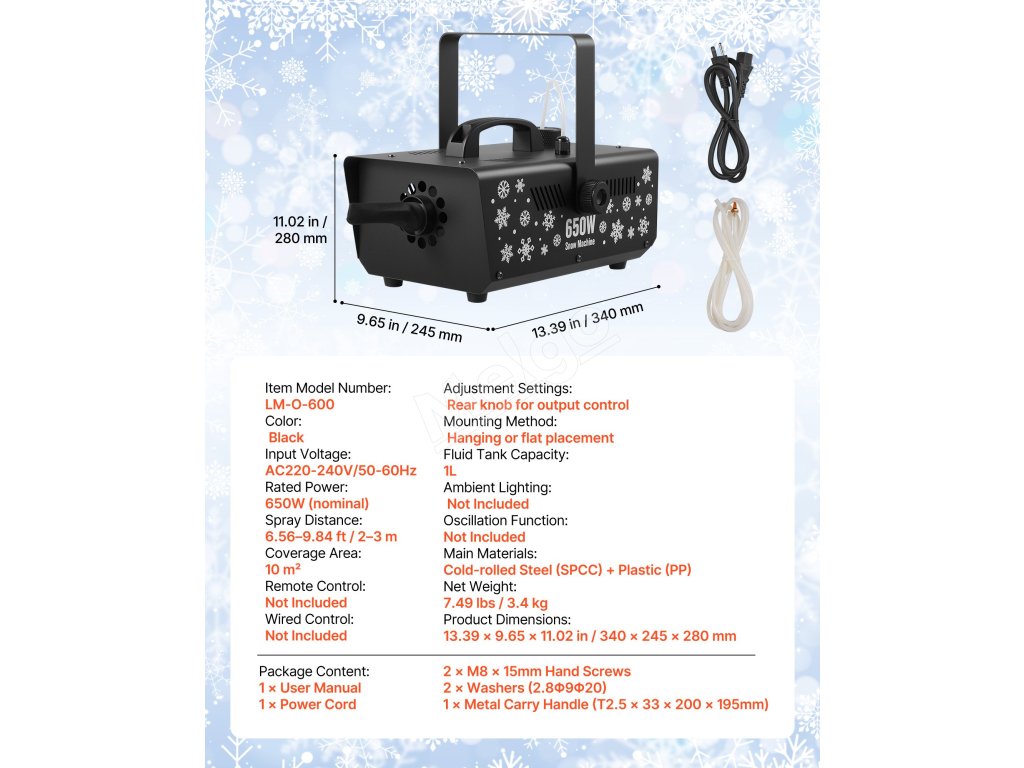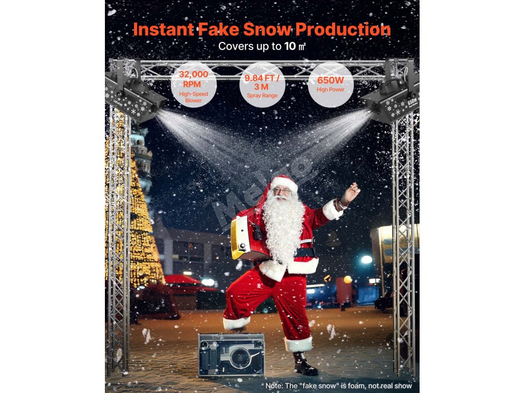 Tento 650W snežný stroj poskytuje dosah striekania 6,56-9,84 ft/2-3 m a pokryje až 10㎡ realistickou penou pripomínajúcou sneh. Podporuje nepretržitý výstup snehu s nastaviteľnou hlasitosťou a rýchlosťou prostredníctvom zabudovaného ovládača . ideálny na vianočnú výzdobu, svadby, divadelné predstavenia, na vytvorenie snovej zimnej scény.