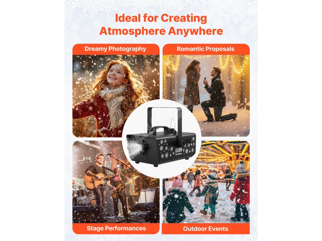 Či už ide o svadbu, sviatočné fotenie, vianočnú oslavu alebo výstavu v obchodnom centre, toto snežné zariadenie rýchlo vytvorí efekt snového sneženia, ktorý pozdvihne celú atmosféru. Dokonalý doplnok pre nezabudnuteľné okamihy a dekorácie so zimnou tematikou.