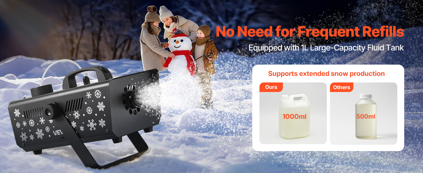 Zostavený s nádržou na tekutinu s objemom 1 l podporuje dlhší výstup snehu bez neustáleho dopĺňania. Náš výrobník snehu je ideálny na večierky, malé scénické inštalácie a priestory podujatí, ktoré potrebujú stabilný tok snehu na udržanie magickej atmosféry bez prerušenia.