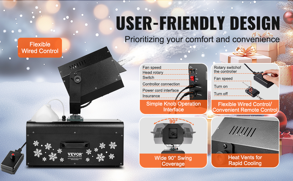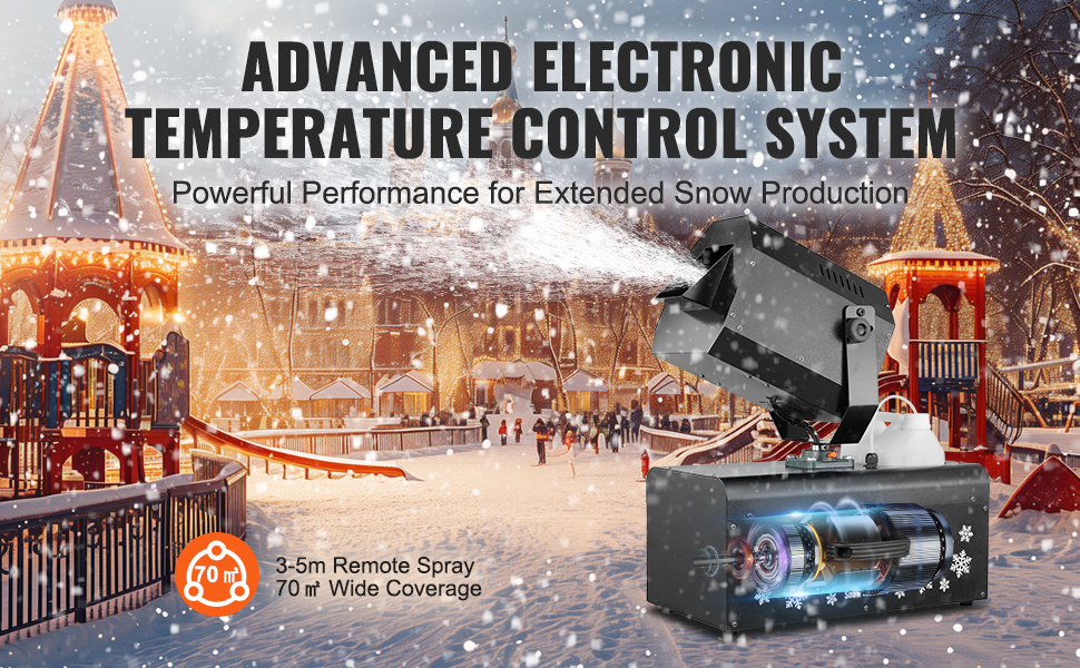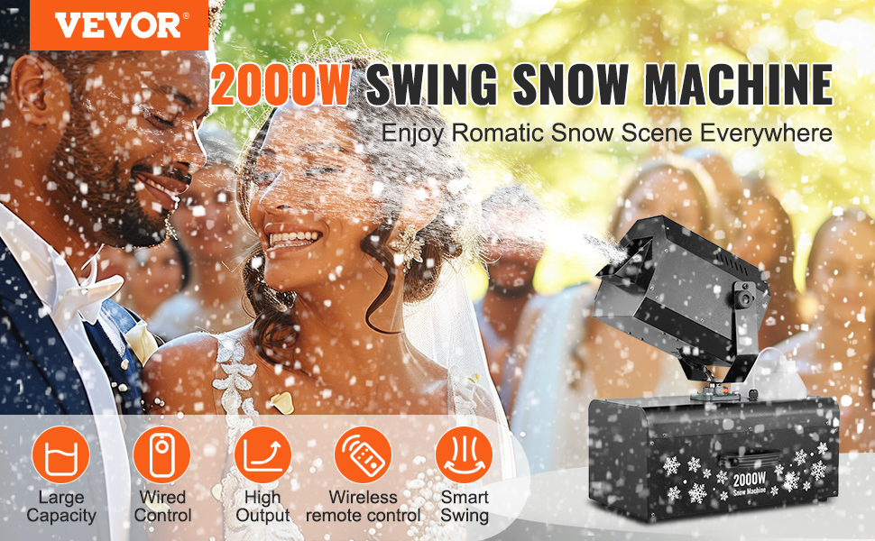 Snežný stroj VEVOR je vybavený výkonným 2000W motorom a veľkou 5l nádržou, vďaka čomu dokáže vyrábať snehové vločky dlhší čas. Vybavený elektronickým systémom regulácie termostatu a kvalitnými čipmi zabezpečuje stabilný výkon. Oscilácia 90° a nastaviteľná rýchlosť uit rôzne nastavenia.