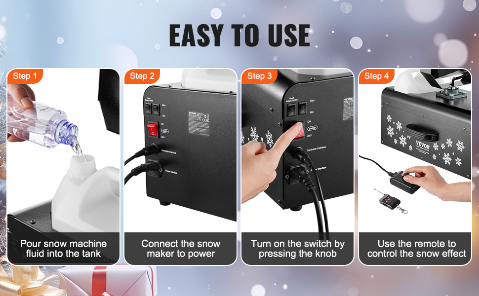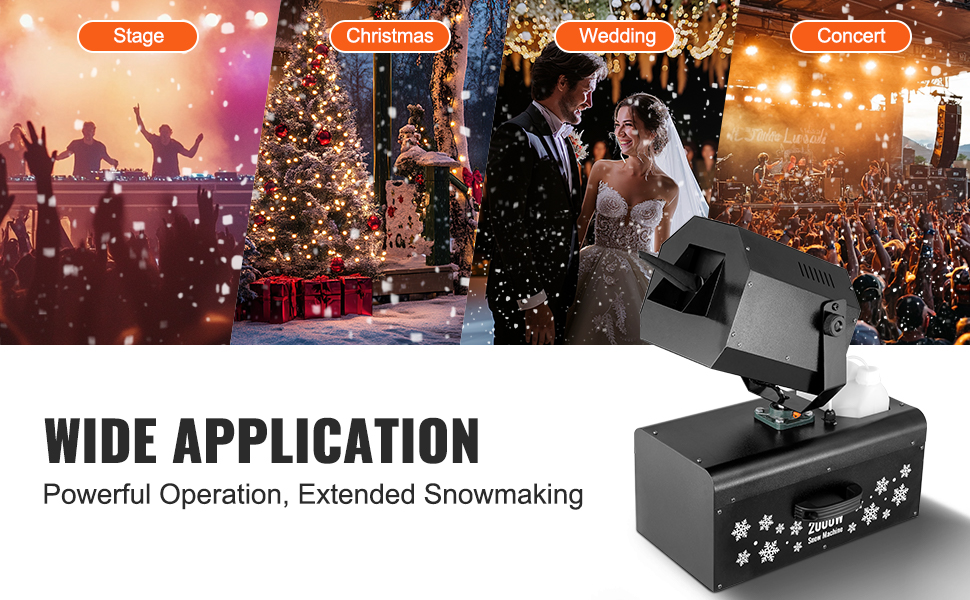 Ideálny na domáce dekorácie, vianočné večierky, prehliadky, narodeninové oslavy, sviatočné podujatia, DJ sety a pódiové vystúpenia. Tento snežný stroj vytvára podmanivý efekt sneženia, čím umocňuje atmosféru a na každého urobí dojem.
