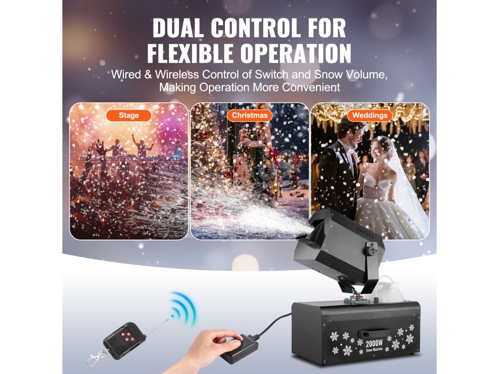 Ideálny na domáce dekorácie, vianočné večierky, prehliadky, narodeninové oslavy, sviatočné podujatia, DJ sety a pódiové vystúpenia. Tento snežný stroj vytvára podmanivý efekt sneženia, čím umocňuje atmosféru a na každého urobí dojem.