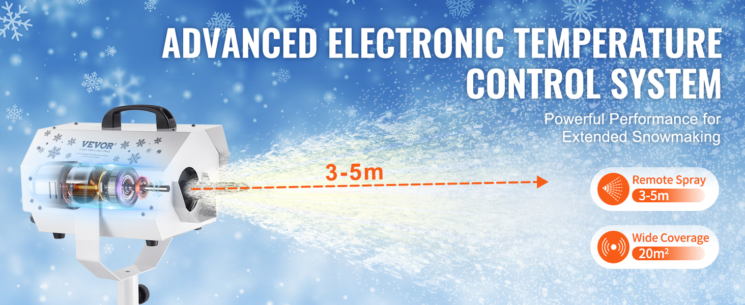 Snežný stroj VEVOR s výškovo nastaviteľným stojanom je vybavený 1200W motorom na dlhšiu dobu výroby snehu. S dlhým dosahom postreku a širokou plochou pokrytia, elektronickým systémom regulácie termostatu a kvalitnými čipmi zabezpečuje stabilný výkon a nastaviteľnú rýchlosť na flexibilné prispôsobenie.