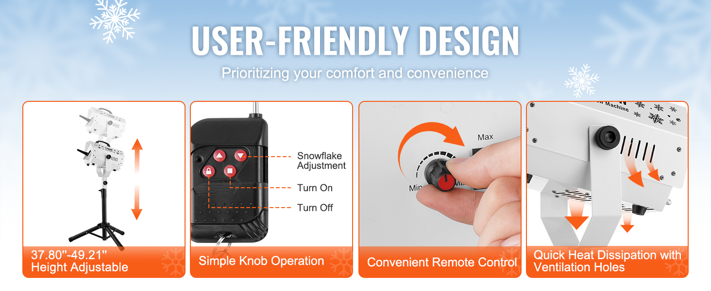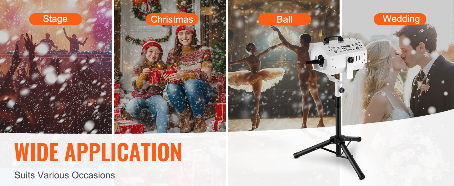 Ideálny na domáce dekorácie, vianočné večierky, prehliadky, narodeninové oslavy, sviatočné podujatia, DJ sety a pódiové vystúpenia. Tento snežný stroj vytvára podmanivý efekt sneženia, čím umocňuje atmosféru a na každého urobí dojem.