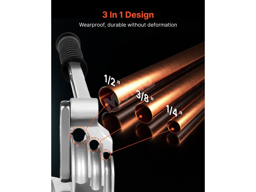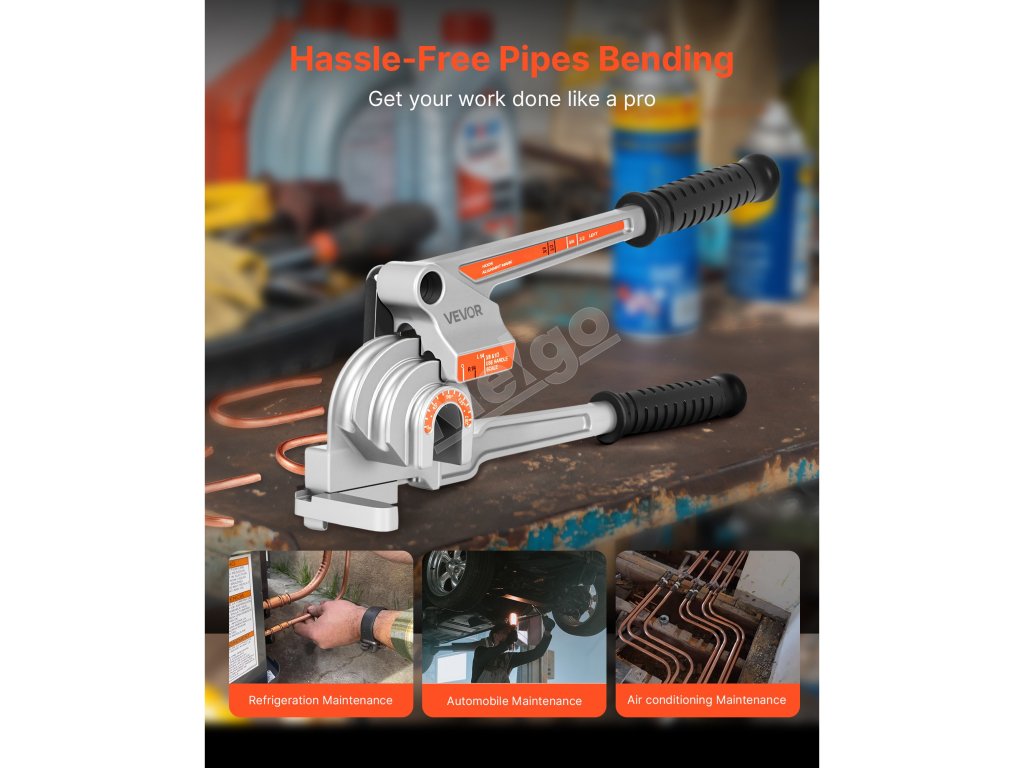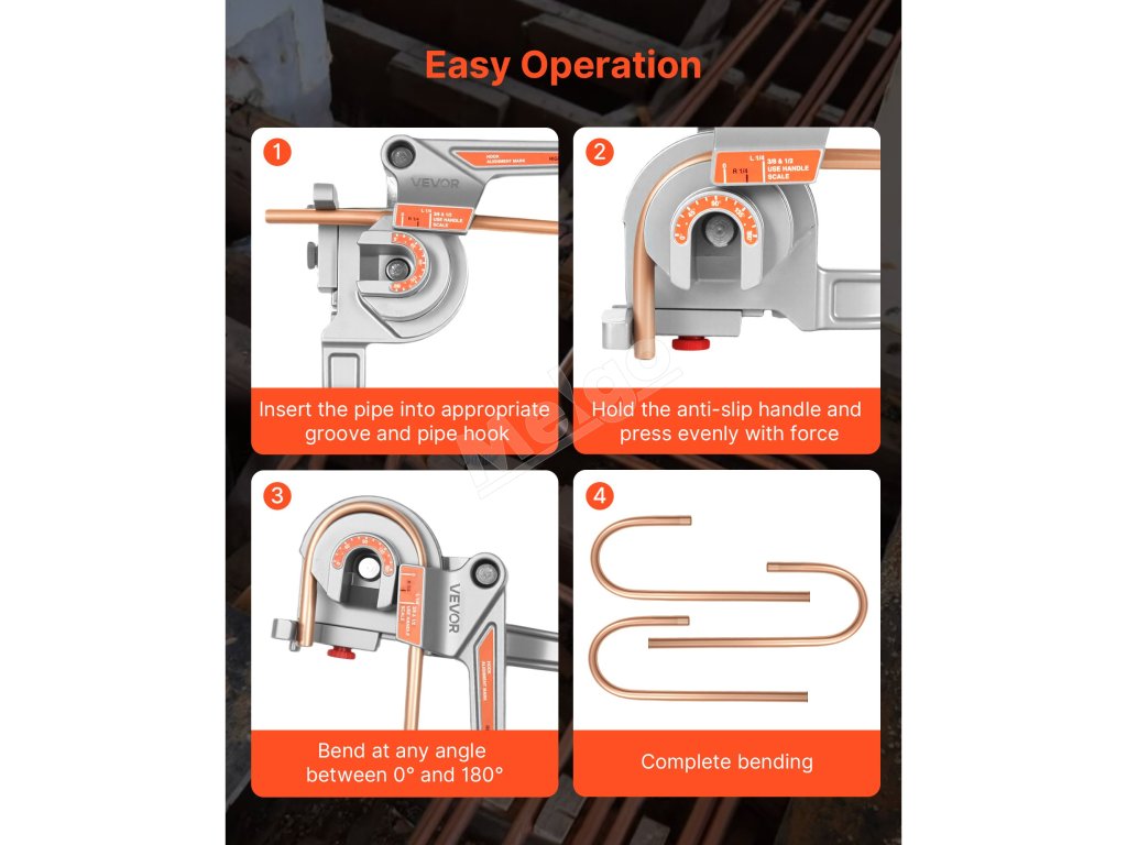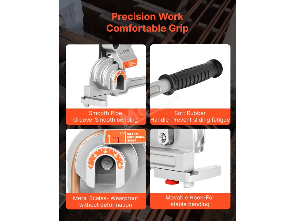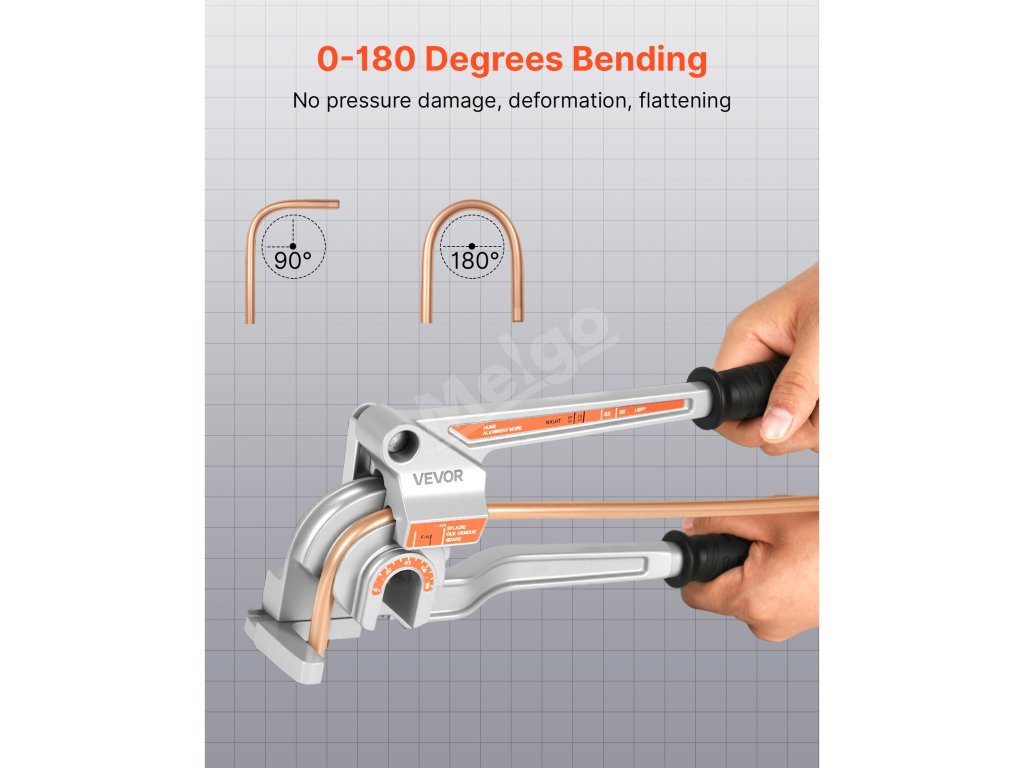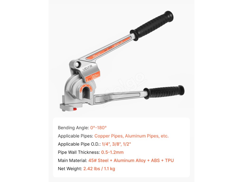 Páková ohýbačka rúr VEVOR je ideálna na ohýbanie medených, hliníkových, tenkých oceľových a nerezových rúr s hrúbkou steny 0,5 - 1,2 mm. Podporuje priemery rúrok 6,35 mm, 9,5 mm a 12,7 mm (1/4 palca, 3/8 palca a 1/2 palca) a umožňuje presné ohýbanie v uhle 0-180° s rovnomerným rozložením sily.