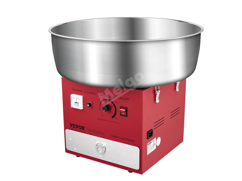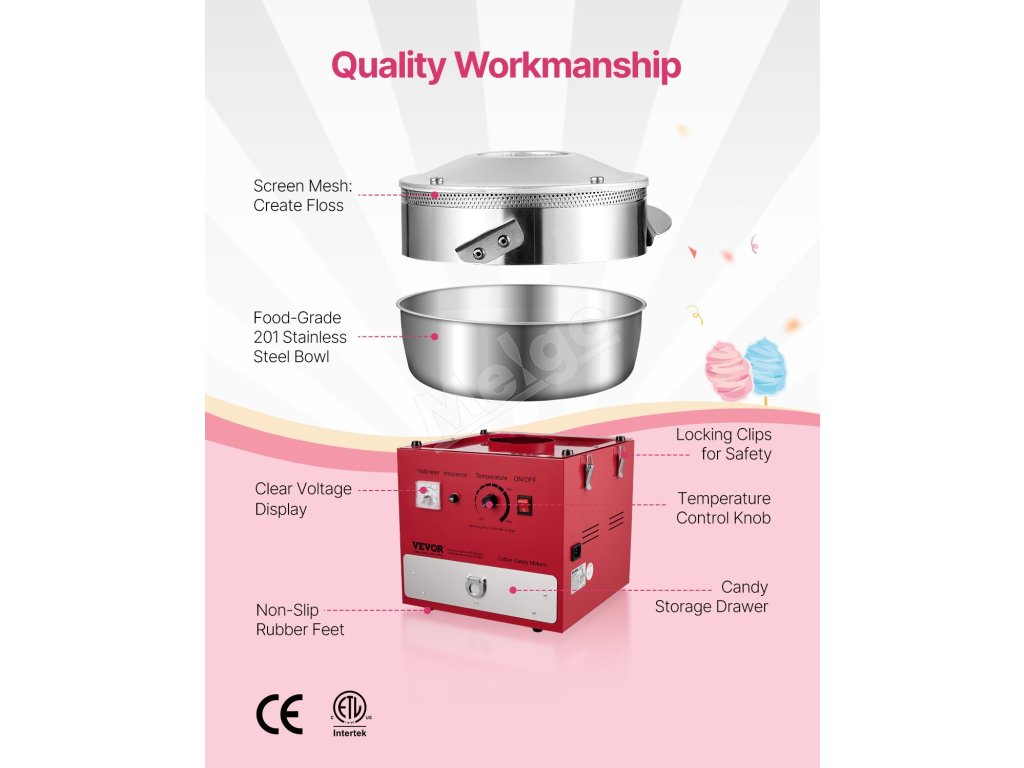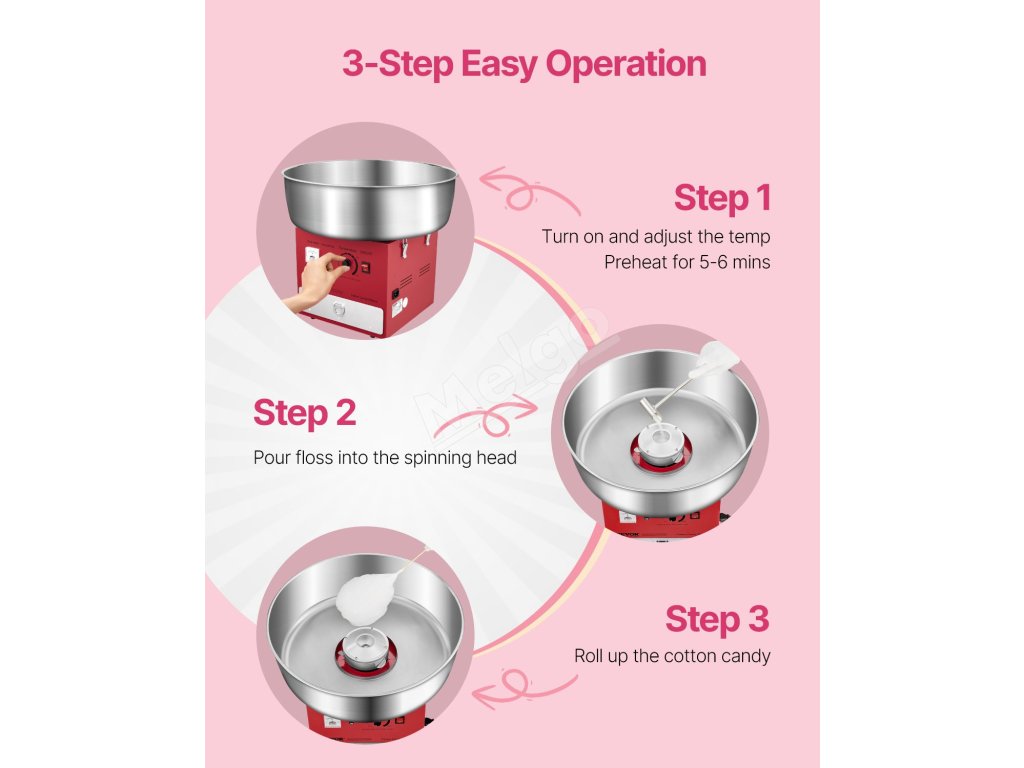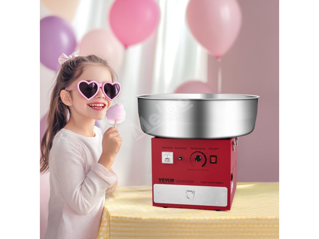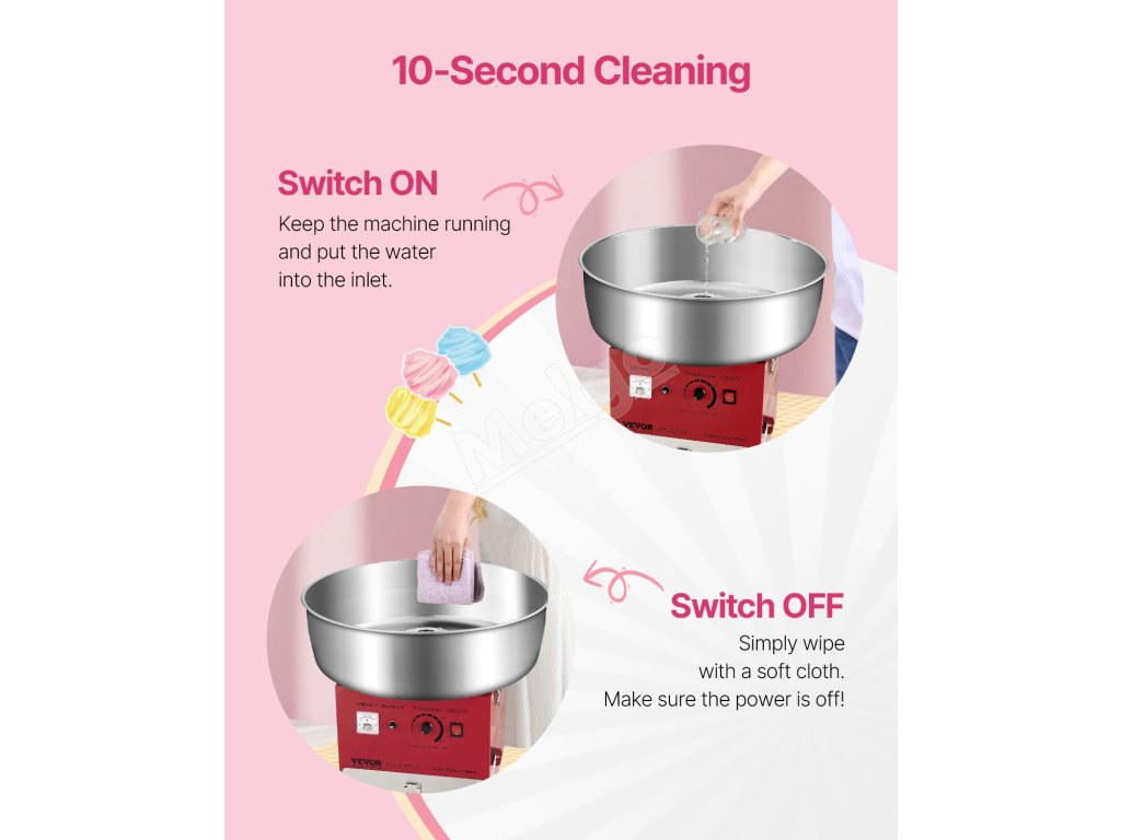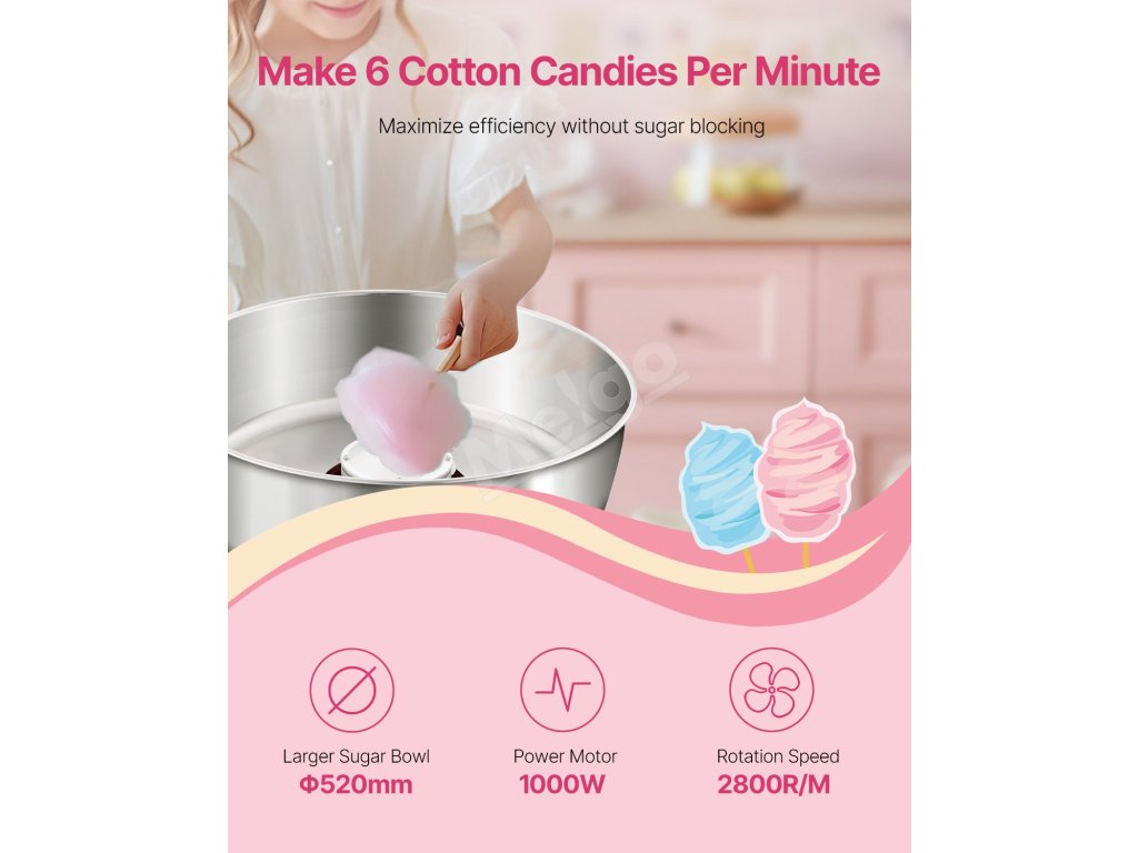 Tento cukrárenský stroj na výrobu cukrovej vaty má 1000W motor a väčšiu nádobu na cukrovinky, ktorá poskytuje max. 6 cukrovej vaty za minútu. Vďaka tomuto zariadeniu je výroba cukrovej vaty efektívnejšia a bez námahy.