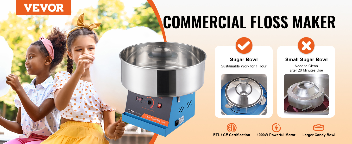 Táto cukrová vata má 1000W motor a väčšiu nádobu na cukrovinky, ktorá poskytuje približne 6 cukrovej vaty za minútu. Tento výrobník cukrovej vaty môže pracovať nepretržite jednu hodinu. Je ideálny na rôzne párty a je vhodný na väčšinu druhov cukru.