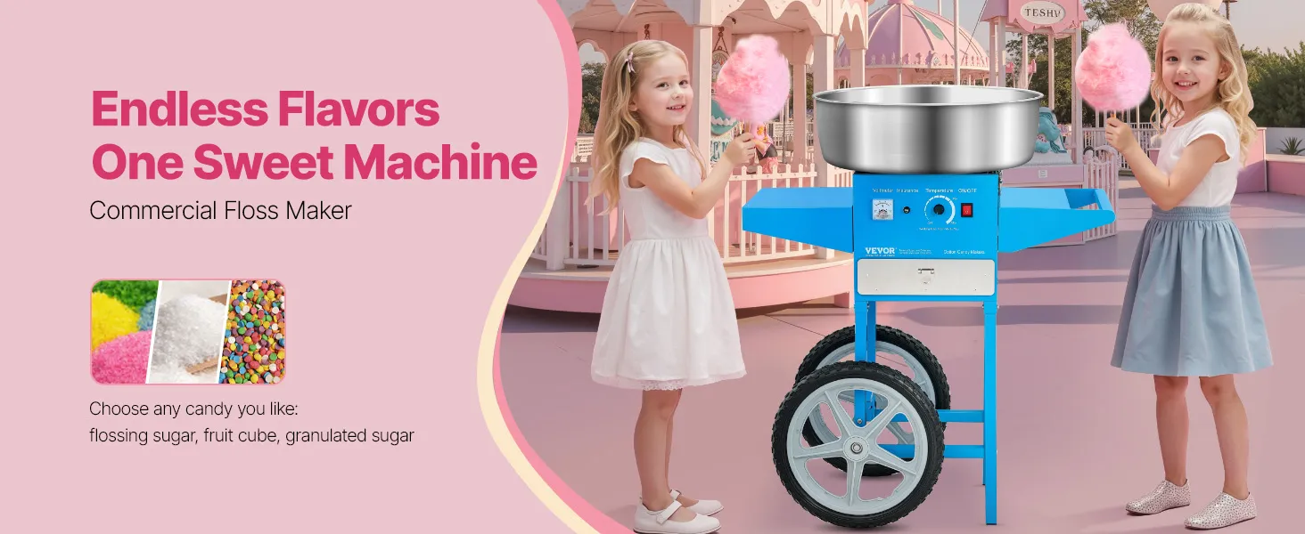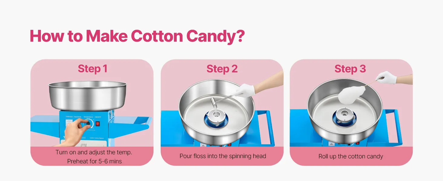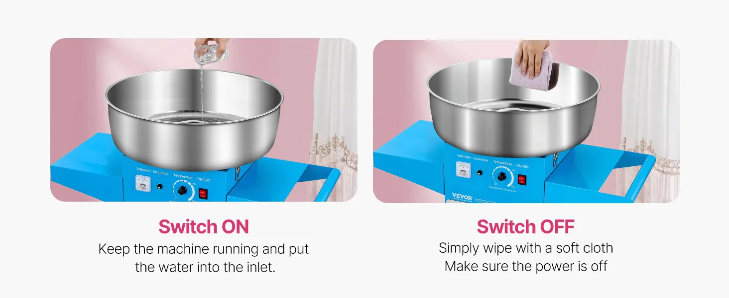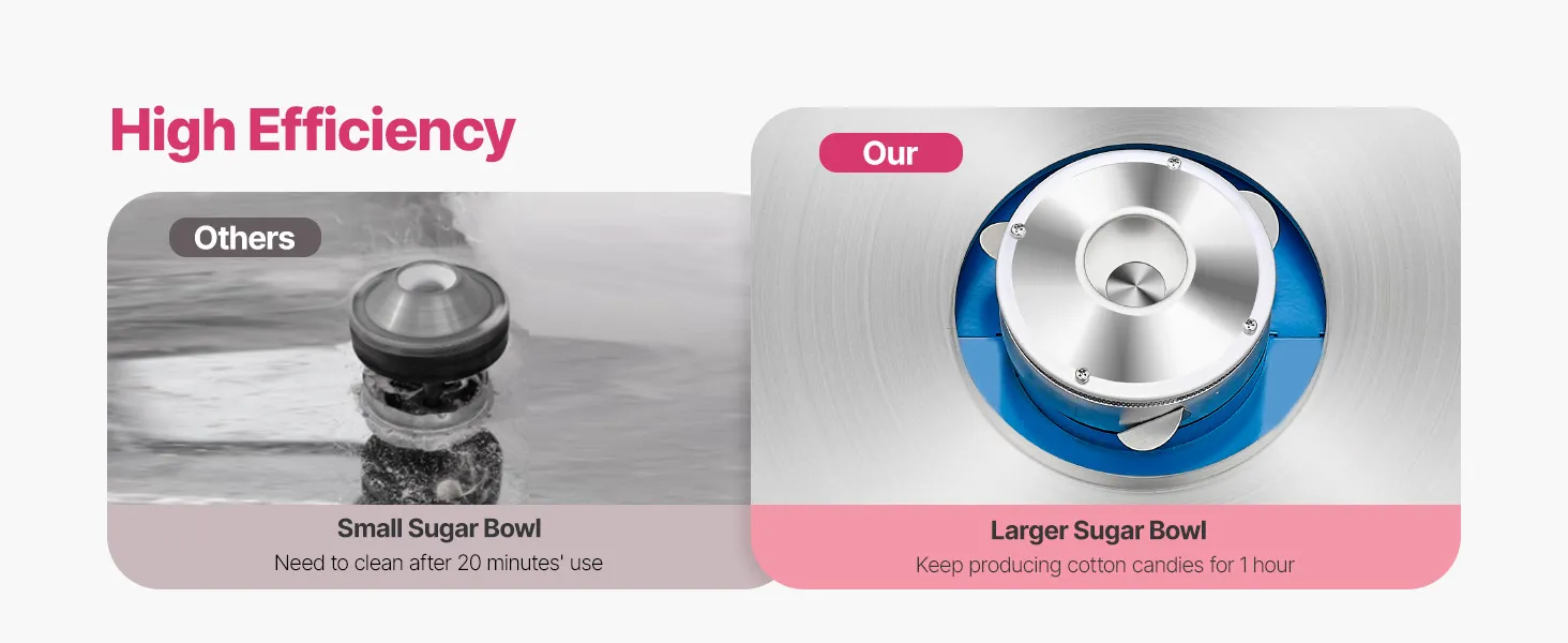 Tento cukrárenský stroj na výrobu cukrovej vaty má 1000W motor a väčšiu nádobu na cukrovinky, ktorá poskytuje max. 6 cukrovej vaty za minútu. Vďaka tomuto zariadeniu je výroba cukrovej vaty efektívnejšia a bez námahy.