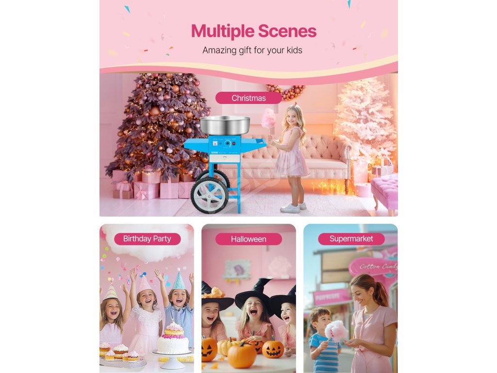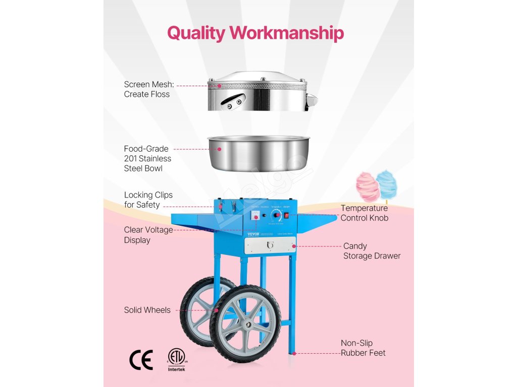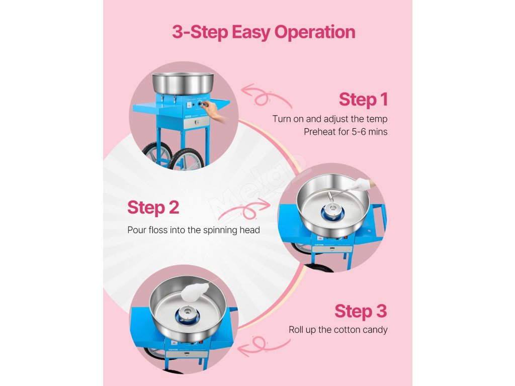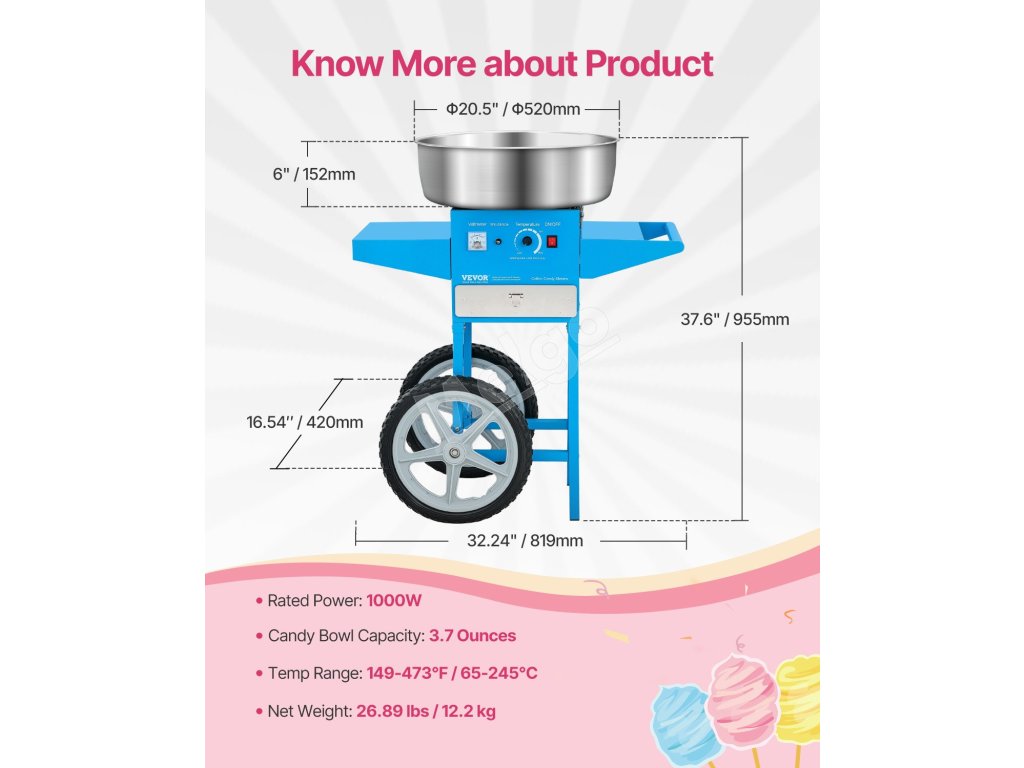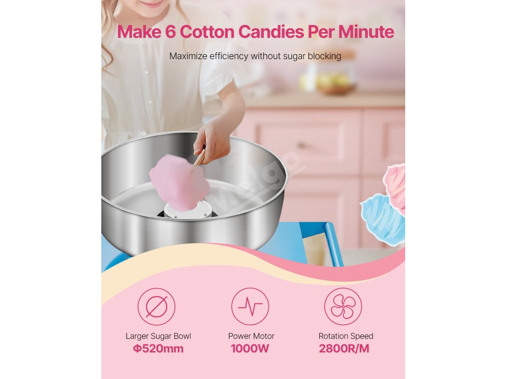 Tento cukrárenský stroj na výrobu cukrovej vaty má 1000W motor a väčšiu nádobu na cukrovinky, ktorá poskytuje max. 6 cukrovej vaty za minútu. Vďaka tomuto zariadeniu je výroba cukrovej vaty efektívnejšia a bez námahy.
