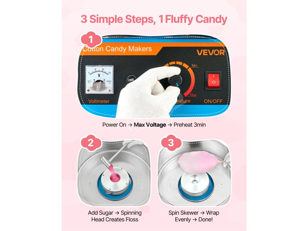 Vyššie napätie na rýchlejší ohrev, maximálne odporúčané napätie na výrobu cukrovej vaty.