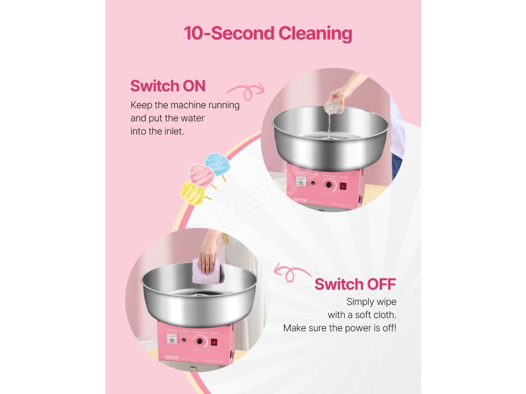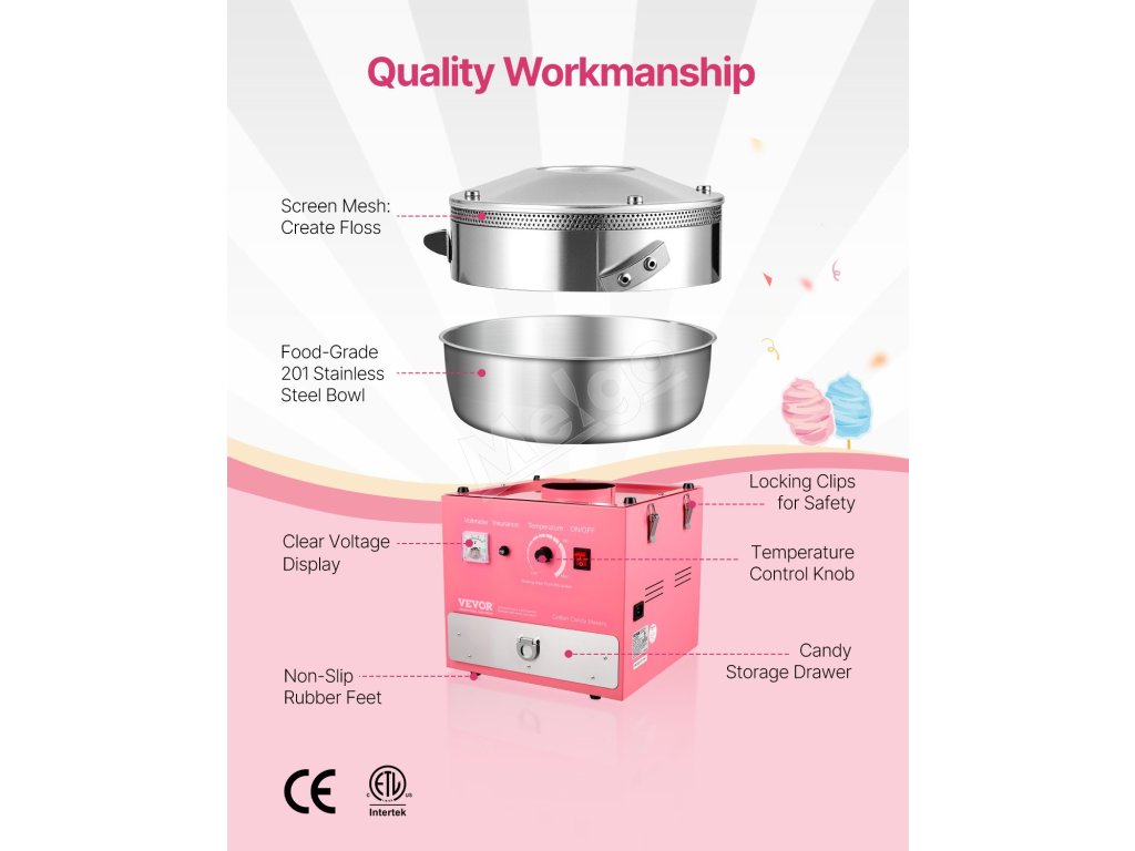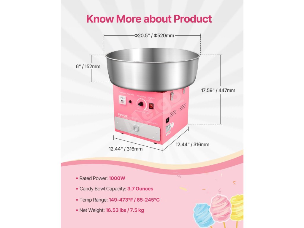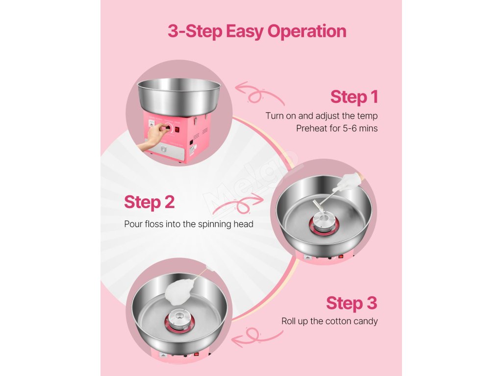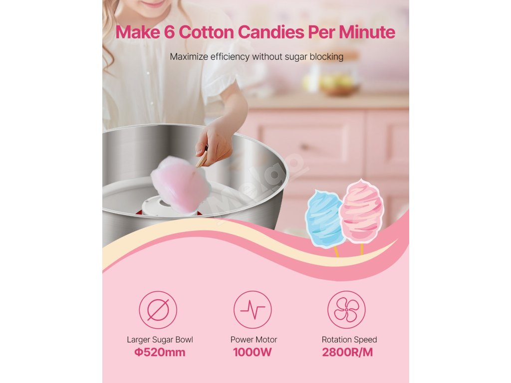 Tento cukrárenský stroj na výrobu cukrovej vaty má 1000W motor a väčšiu nádobu na cukrovinky, ktorá poskytuje max. 6 cukrovej vaty za minútu. Vďaka tomuto zariadeniu je výroba cukrovej vaty efektívnejšia a bez námahy.