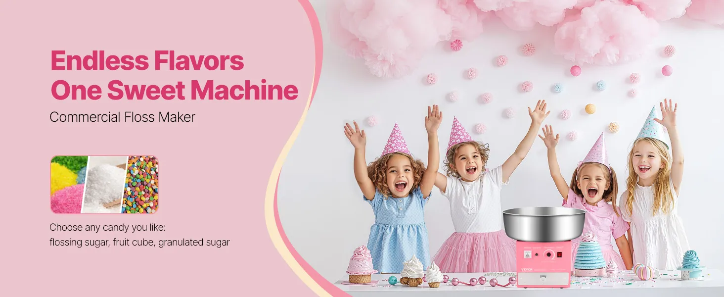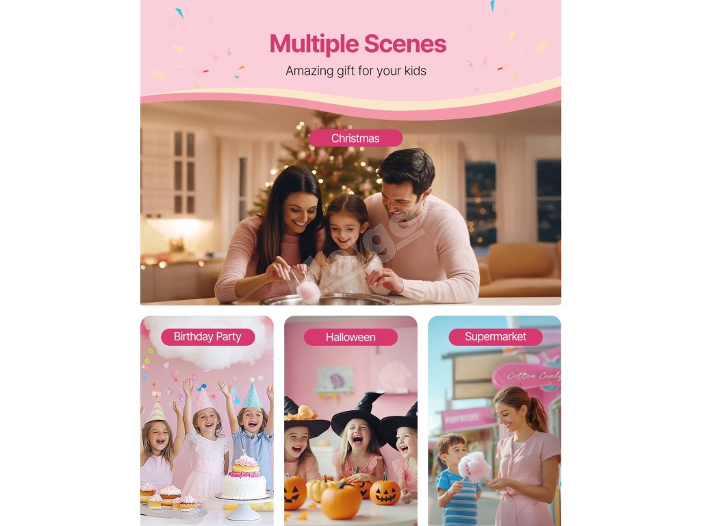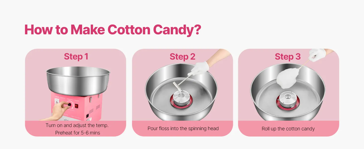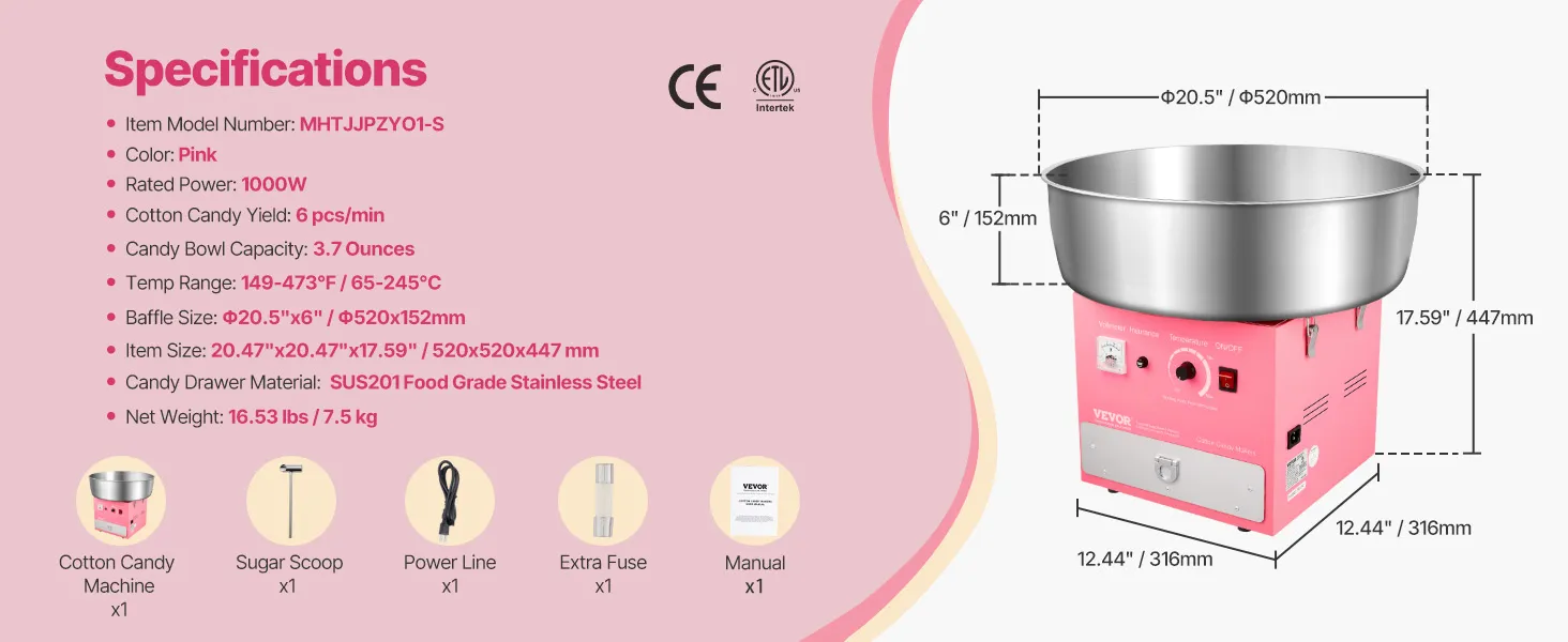 Tento cukrárenský stroj na výrobu cukrovej vaty má 1000W motor a väčšiu nádobu na cukrovinky, ktorá poskytuje max. 6 cukrovej vaty za minútu. Vďaka tomuto zariadeniu je výroba cukrovej vaty efektívnejšia a bez námahy.