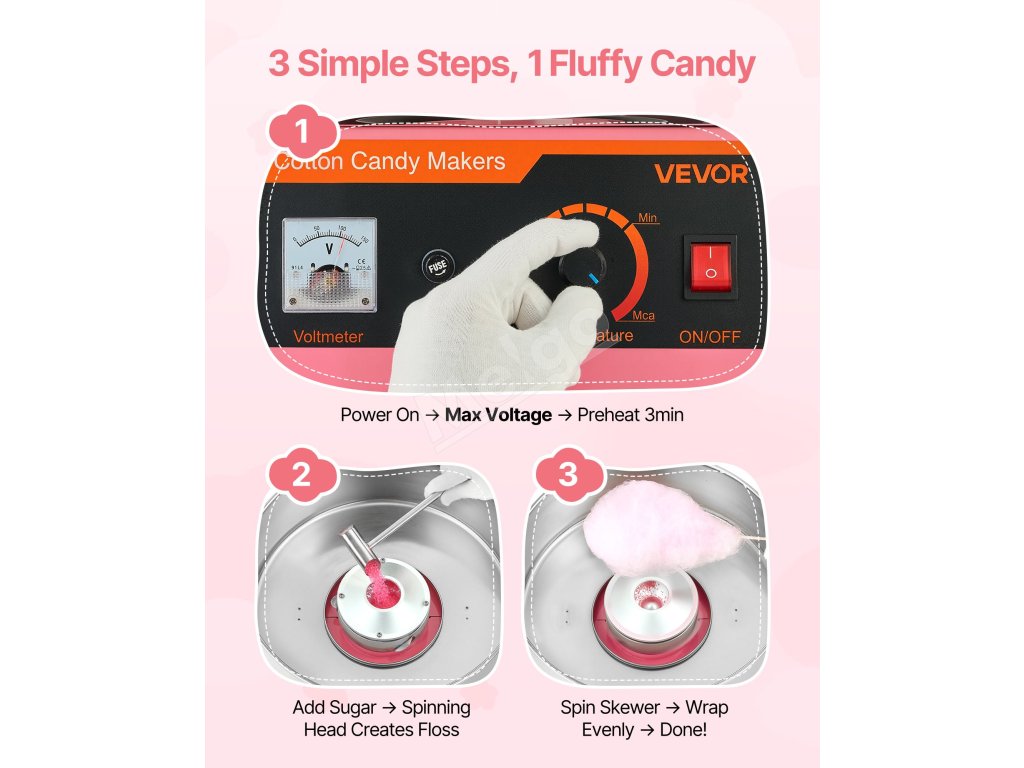 Vyššie napätie na rýchlejší ohrev, maximálne odporúčané napätie na výrobu cukrovej vaty.