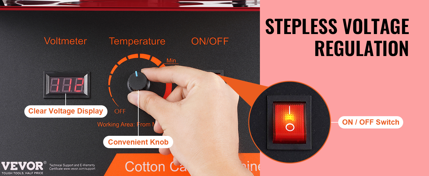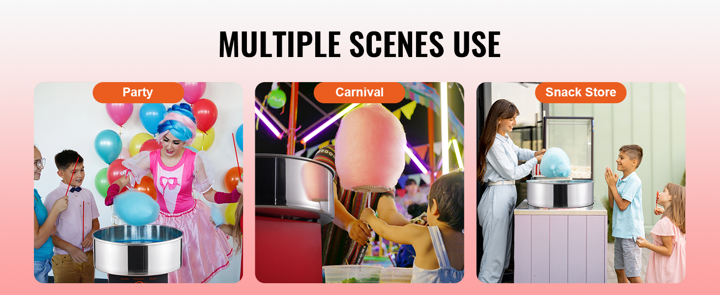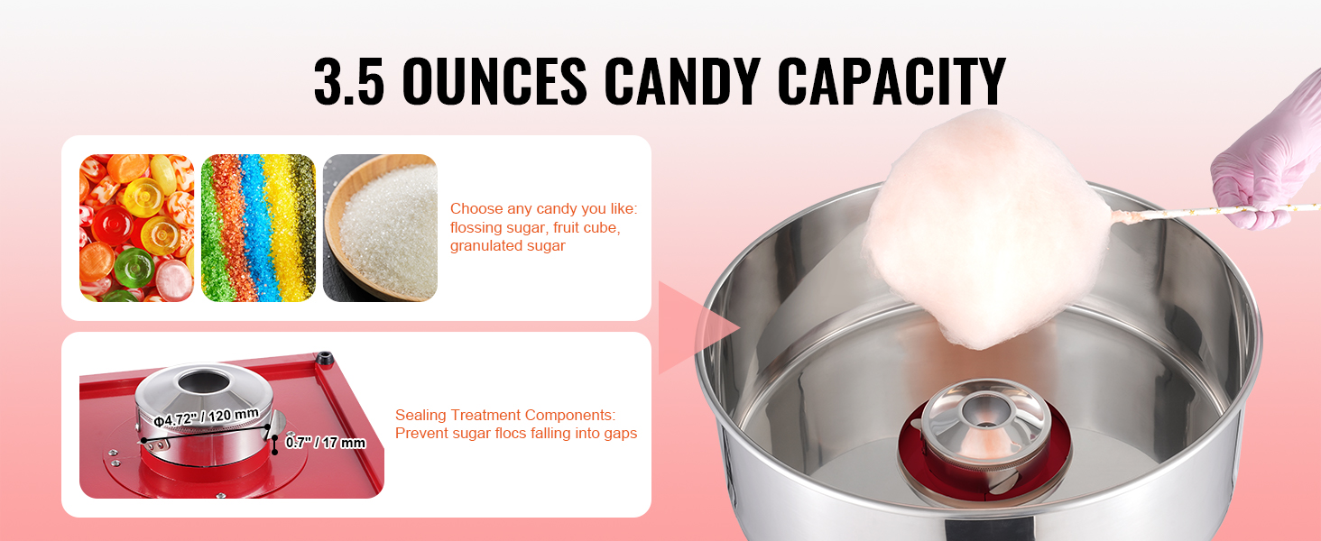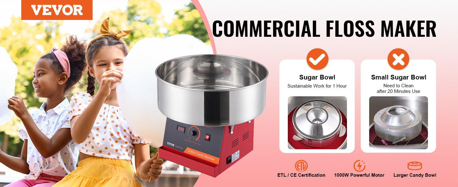 Táto cukrová vata má 1000W motor a väčšiu nádobu na cukrovinky, ktorá poskytuje približne 6 cukrovej vaty za minútu. Tento výrobník cukrovej vaty môže pracovať nepretržite jednu hodinu. Je ideálny na rôzne párty a je vhodný na väčšinu druhov cukru.