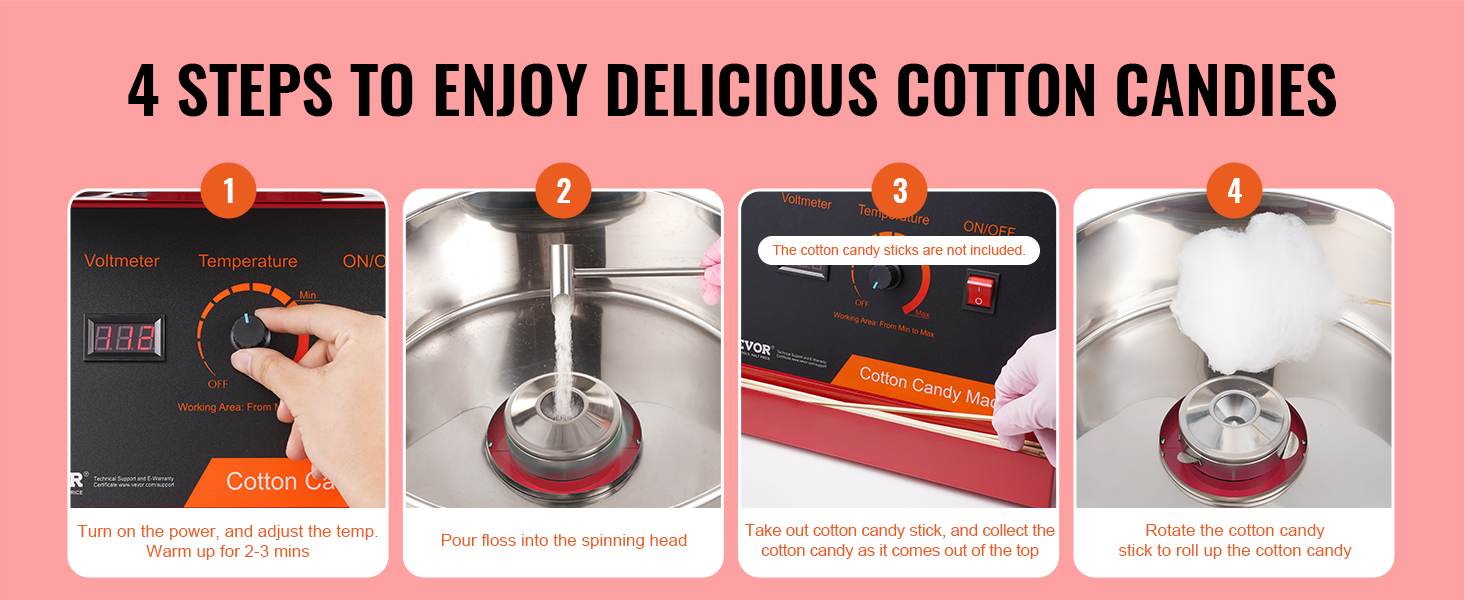 Používanie tohto stroja už nemôže byť jednoduchšie. 4 kroky na výrobu chutnej a rozmanitej cukrovej vaty!