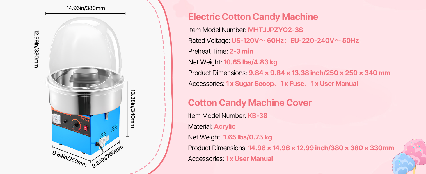 | Rozmery stroja na cukrovú vatu | 14.96 x 14,96 x 13,31 palca/380 x 380 x 338 mm |