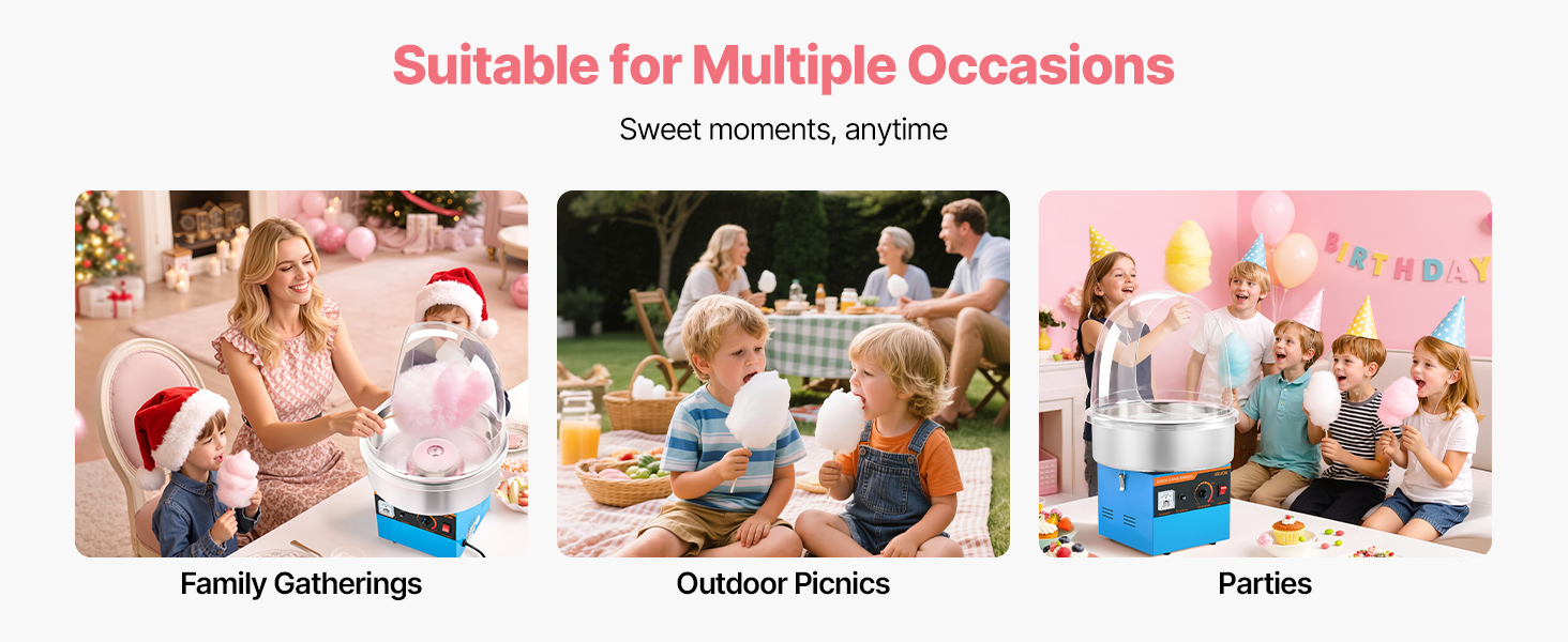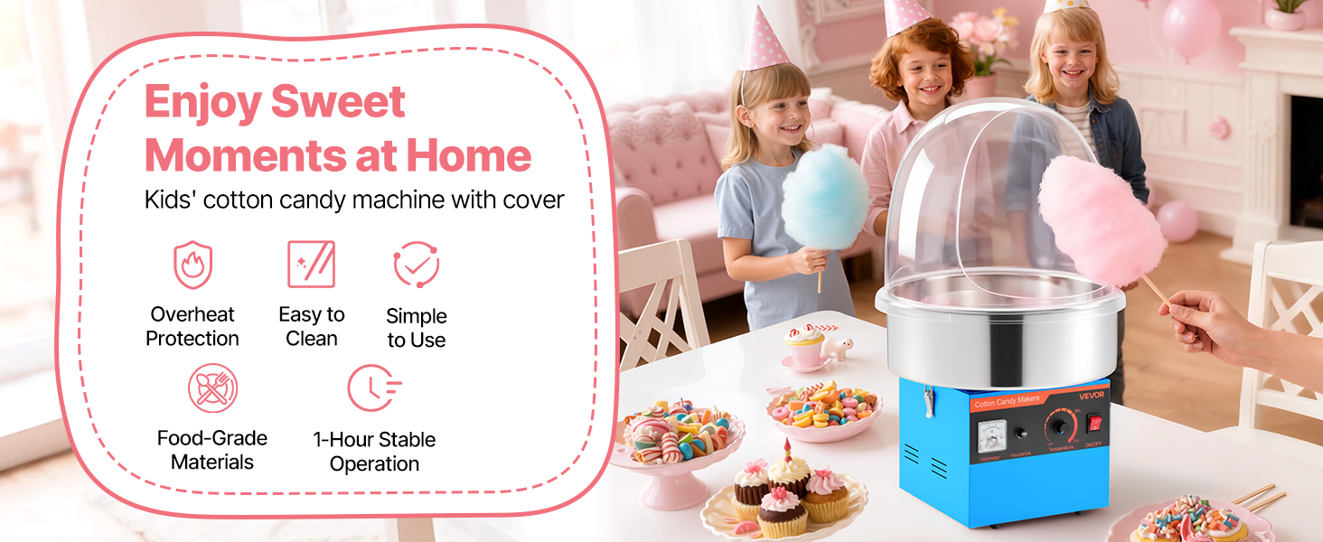 Vychutnajte si cukrovú vatu kedykoľvek s týmto strojom na cukrovú vatu VEVOR vybaveným vekom. Skvele sa hodí na narodeniny, slávnostné podujatia, párty na dvore alebo v cukrárňach, vďaka čomu je podávanie sladkých dobrôt pútavé a zábavné a vytvára radostné spomienky pre rodinu, priateľov aj hostí.