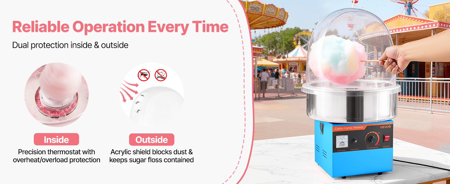S týmto elektrickým strojčekom na cukrovú vatu s ochranným vekom vytvoríte cukrovú vatu za pár minút. Jednoducho ho zapojte do zásuvky, pridajte cukor, predhrejte a roztočte cukor pri 3500 otáčkach za minútu až na 1 hodinu. Je vyrobený z potravinárskej nehrdzavejúcej ocele a hliníka, priehľadný štít zabraňuje šíreniu nečistôt, ideálny na párty alebo domácu zábavu.
