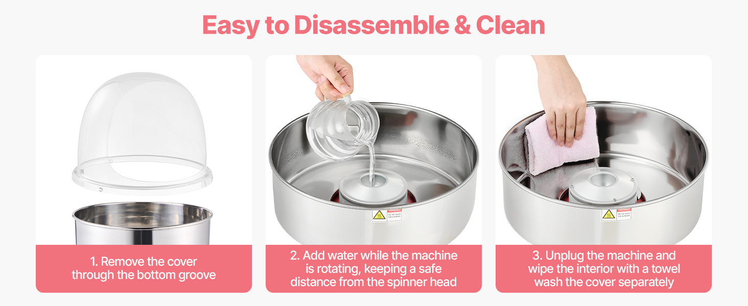 Čistenie je s týmto komerčným strojom na cukrovú vatu jednoduché. Zapustený dizajn veka umožňuje jednoduché odstránenie. Počas točenia opláchnite cukrovú misu, aby ste odstránili zvyšky cukru, potom odpojte a utrite vnútro a veko, aby bol stroj vždy čistý a pripravený na lahodnú cukrovú vatu.