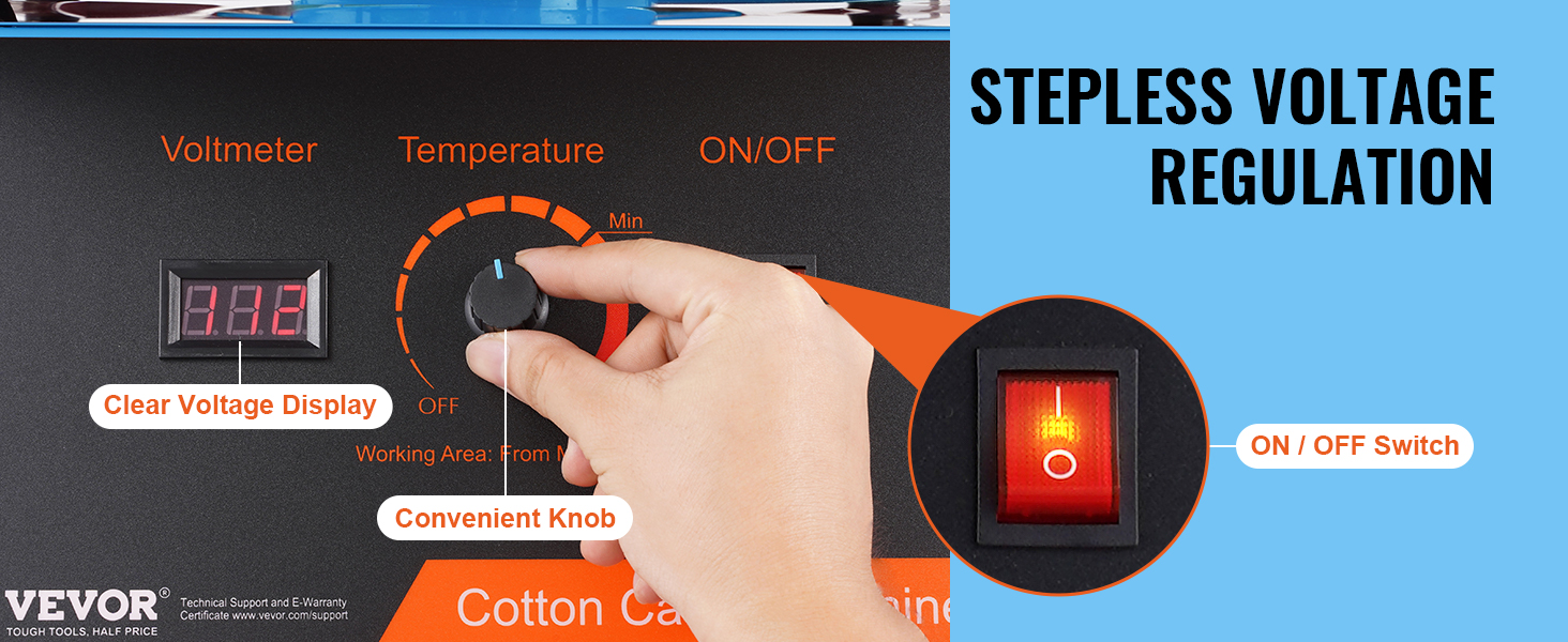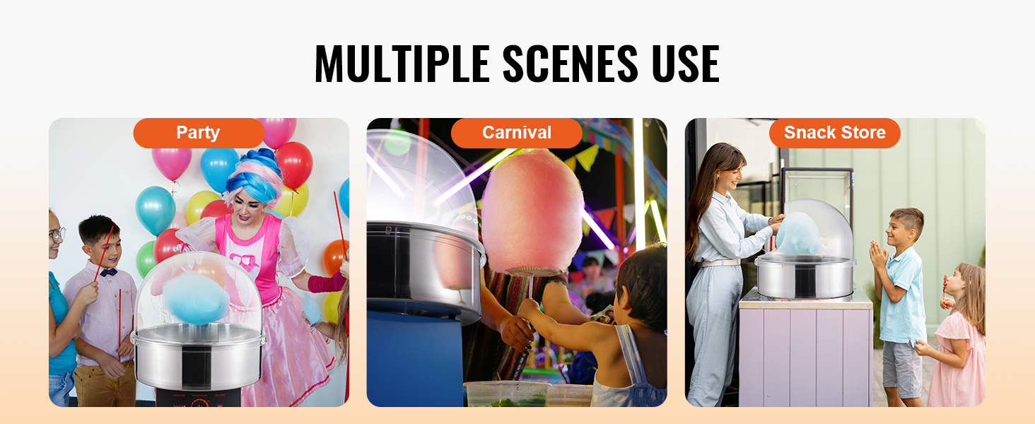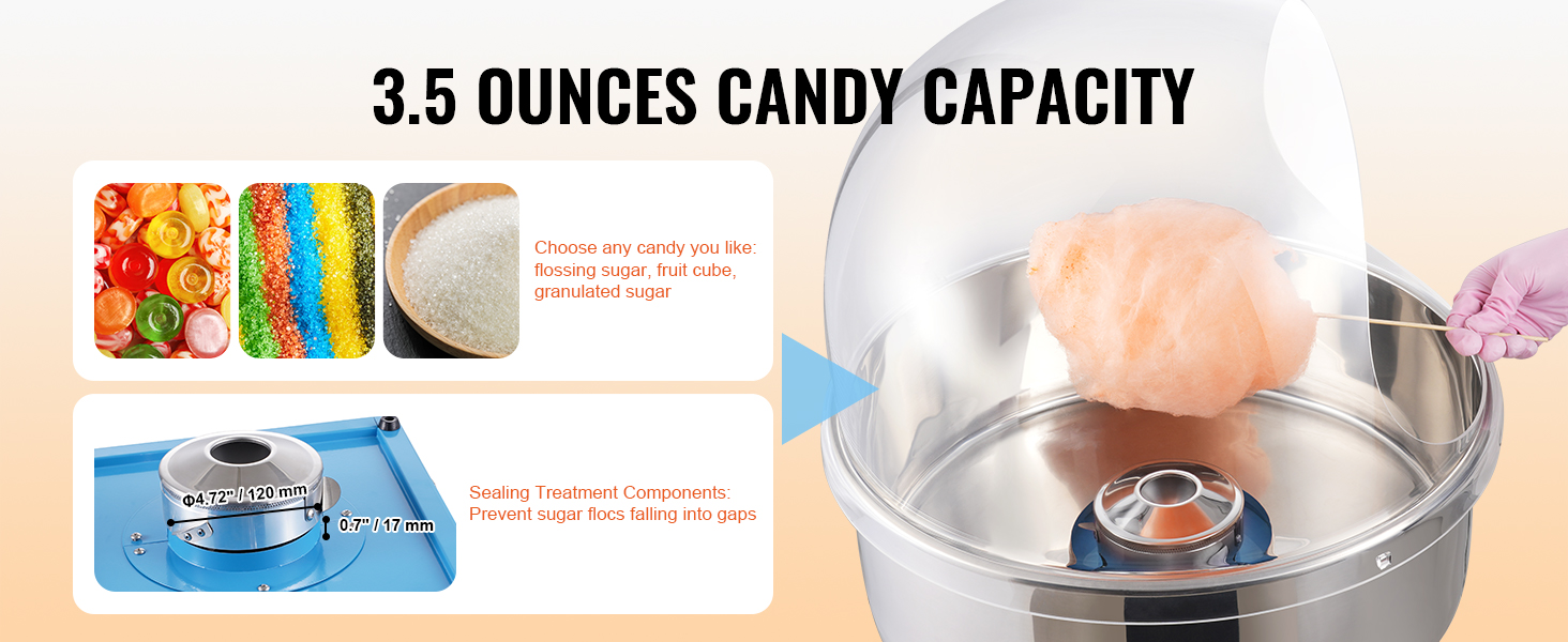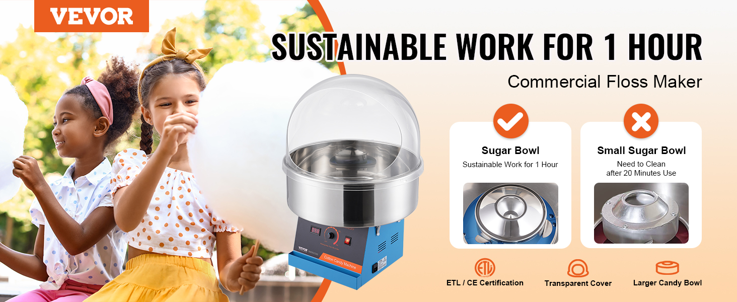 Táto cukrová vata má 1000W motor a väčšiu nádobu na cukrovinky, ktorá poskytuje približne 6 cukrovej vaty za minútu. Tento výrobník cukrovej vaty môže pracovať nepretržite jednu hodinu. Je ideálny na rôzne párty a je vhodný na väčšinu druhov cukru.