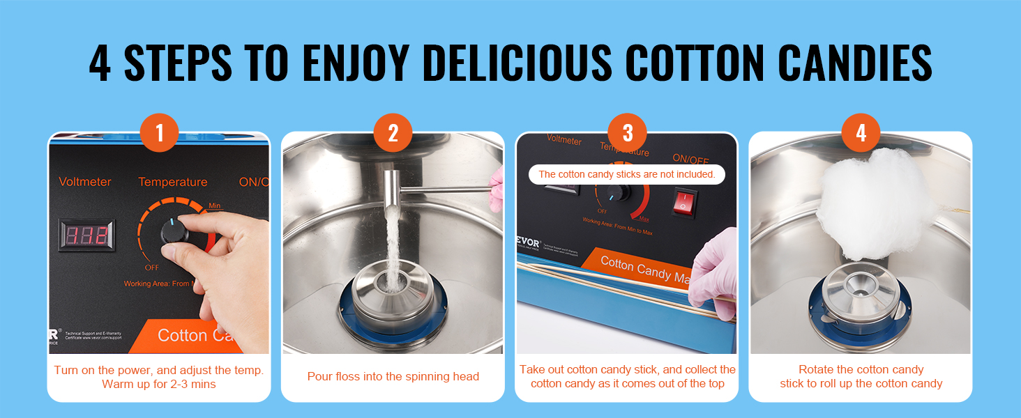 Používanie tohto stroja už nemôže byť jednoduchšie. 4 kroky na výrobu chutnej a rozmanitej cukrovej vaty!