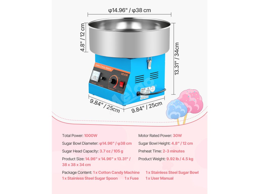 Stroj na cukrovú vatu elektrický 1000W, nerezová miska 38 cm, lopatka