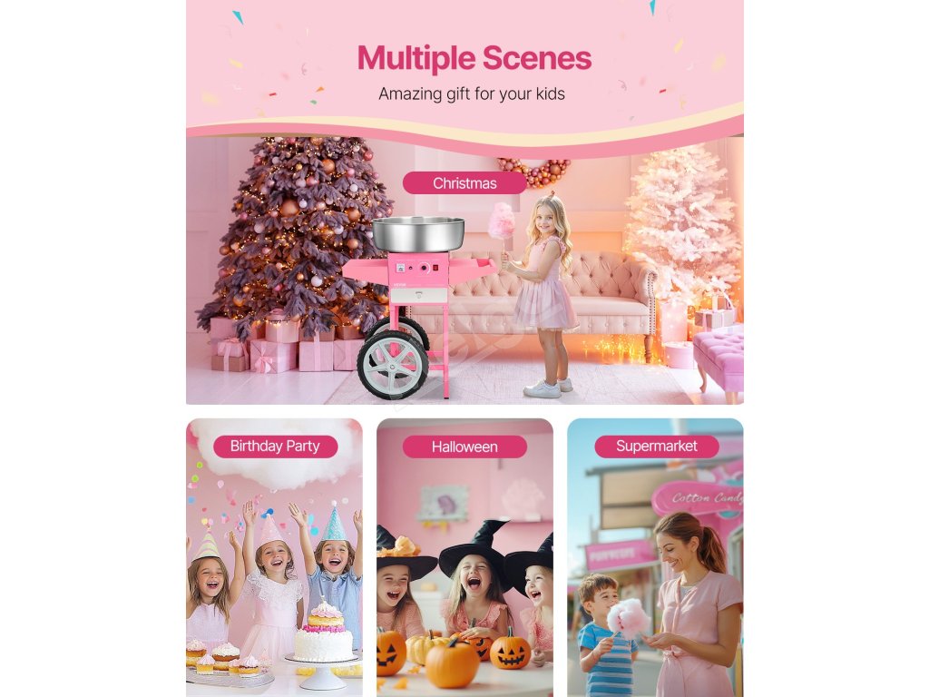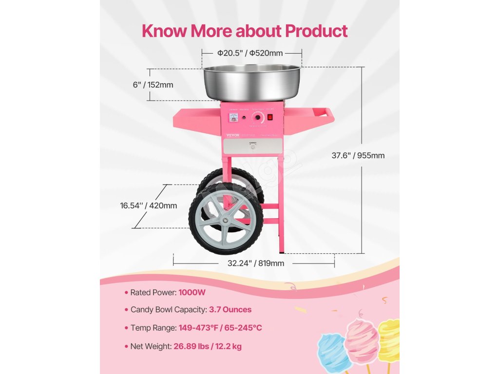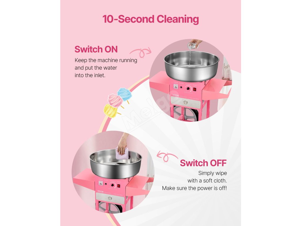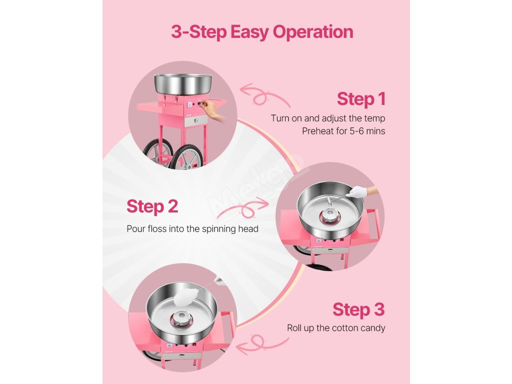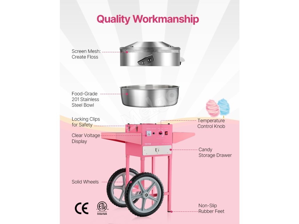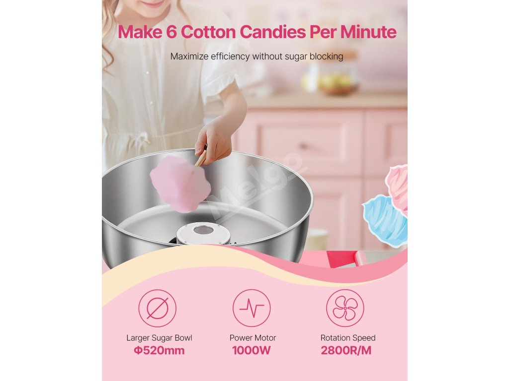 Tento cukrárenský stroj na výrobu cukrovej vaty má 1000W motor a väčšiu nádobu na cukrovinky, ktorá poskytuje max. 6 cukrovej vaty za minútu. Vďaka tomuto zariadeniu je výroba cukrovej vaty efektívnejšia a bez námahy.