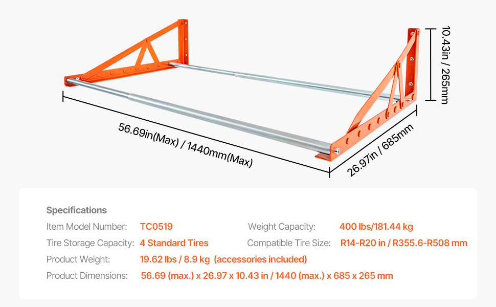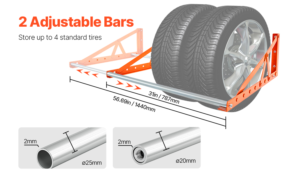 Tento stojan na uskladnenie pneumatík je vybavený predĺžiteľnými podpornými tyčami nastaviteľnými v rozsahu 31 - 56 palcov a umožňuje uskladniť až 4 štandardné pneumatiky mimo zeme. Je kompatibilný s pneumatikami s rozmermi R14-R20 palcov a ponúka flexibilné riešenie skladovania pre vašu garáž alebo dielňu.