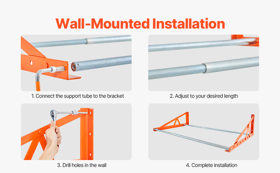 Tento nástenný stojan na pneumatiky sa jednoducho inštaluje. Stačí si vybrať požadované miesto a šírku, vyvŕtať otvory na príslušných miestach na stene a upevniť ho dodanými skrutkami. Podľa potreby môžete nastaviť dĺžku a premiestniť stojan, aby sa prispôsobil vašim potrebám.