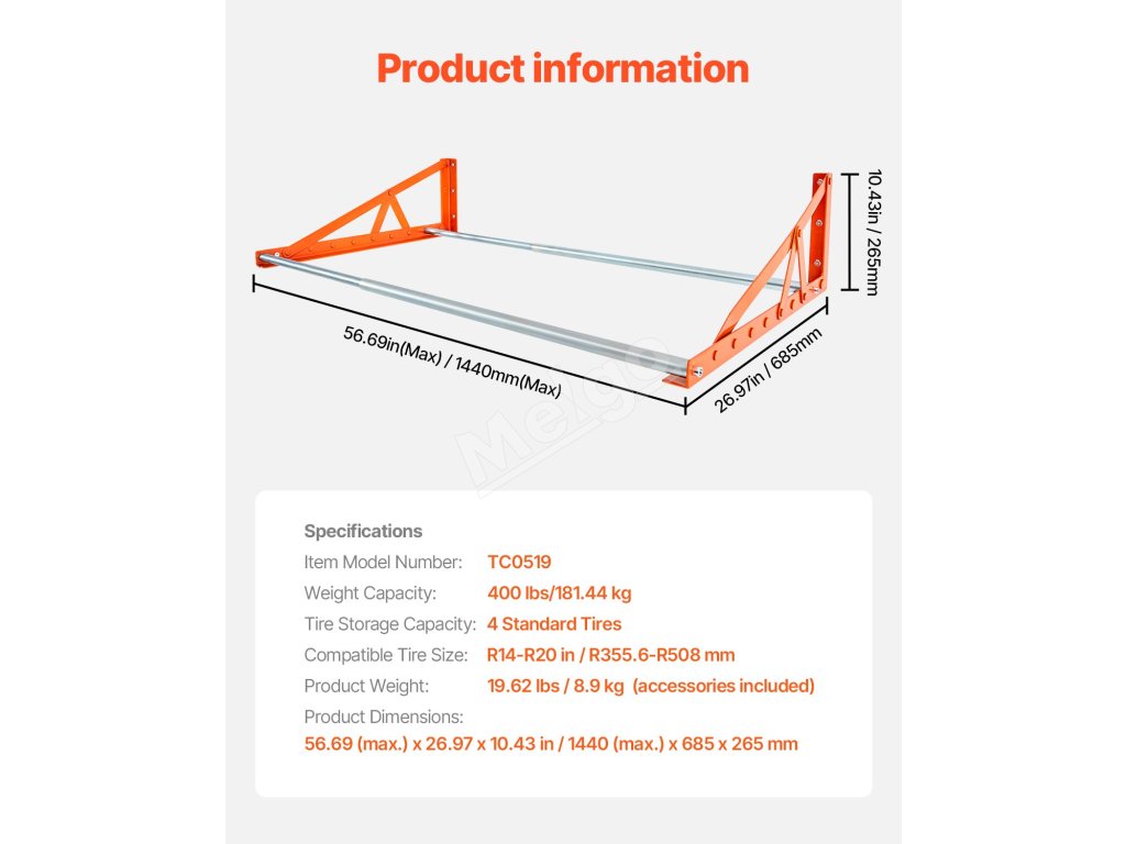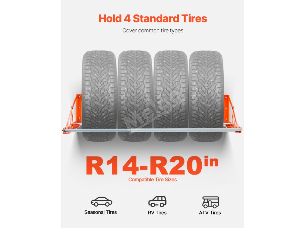 Tento stojan na uskladnenie pneumatík je vybavený predĺžiteľnými podpornými tyčami nastaviteľnými v rozsahu 31 - 56 palcov a umožňuje uskladniť až 4 štandardné pneumatiky mimo zeme. Je kompatibilný s pneumatikami s rozmermi R14-R20 palcov a ponúka flexibilné riešenie skladovania pre vašu garáž alebo dielňu.