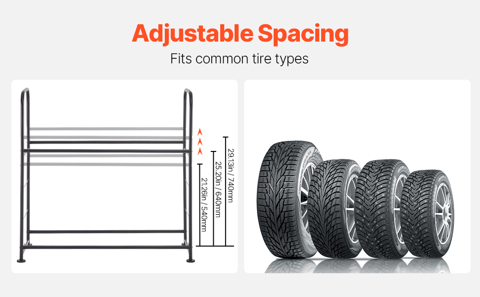 Vďaka 3-úrovňovému nastaveniu výšky sa tento stojan na uskladnenie pneumatík prispôsobí rôznym rozmerom pneumatík, od sezónnych pneumatík až po pneumatiky pre obytné vozidlá, štvorkolky a nákladné vozidlá, a ponúka flexibilné riešenie na uskladnenie, ktoré vyhovuje vašim potrebám a chráni pneumatiky pred deformáciou.