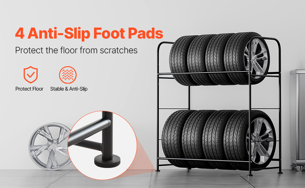 Tento stojan na uskladnenie pneumatík je vybavený 4 protišmykovými podložkami pod nohy na zvýšenie stability. Dodáva sa s potrebným montážnym príslušenstvom a jednoduchým návodom na rýchle nastavenie.