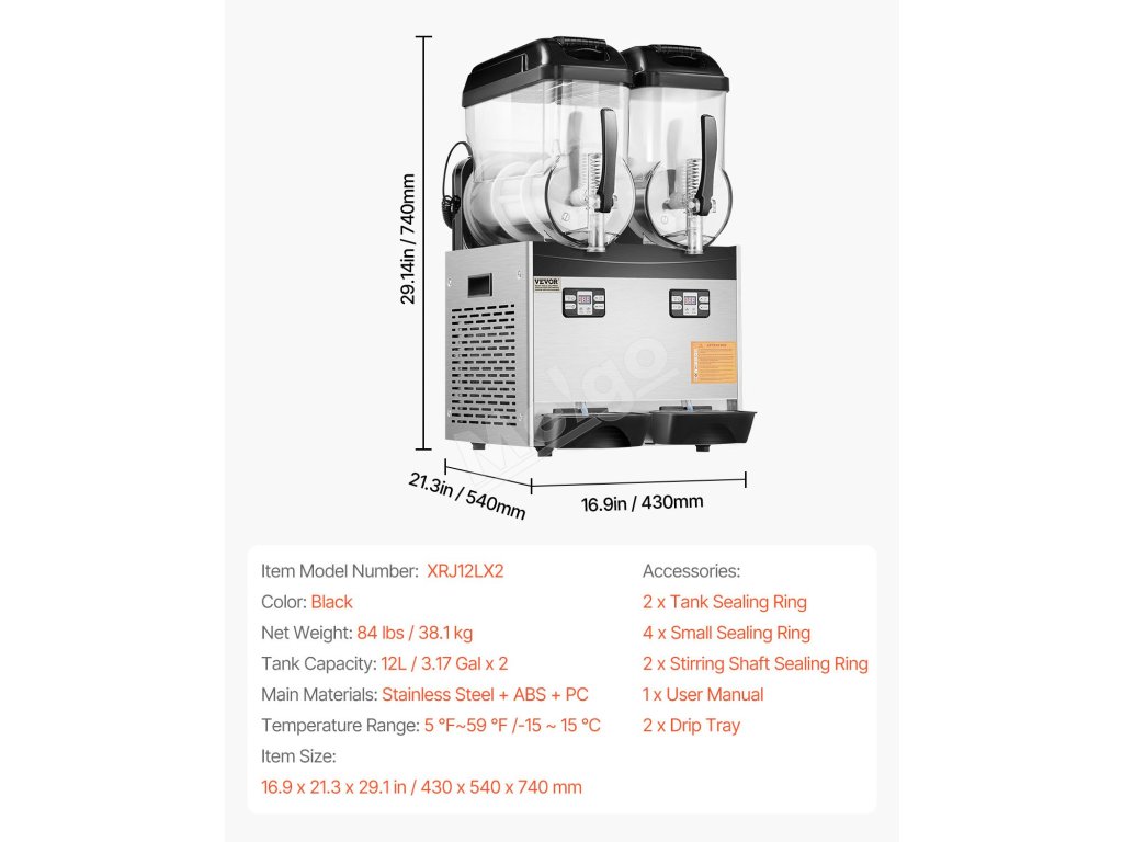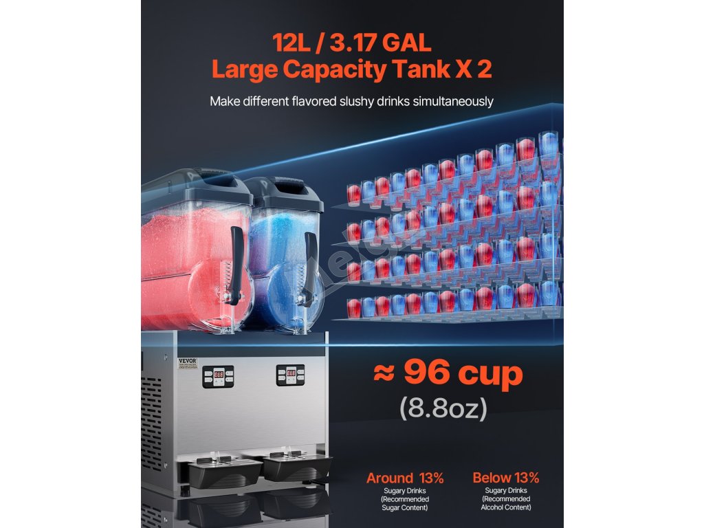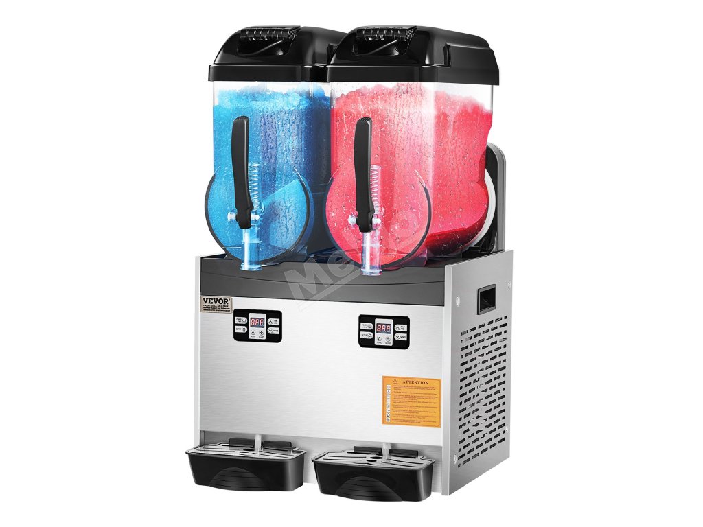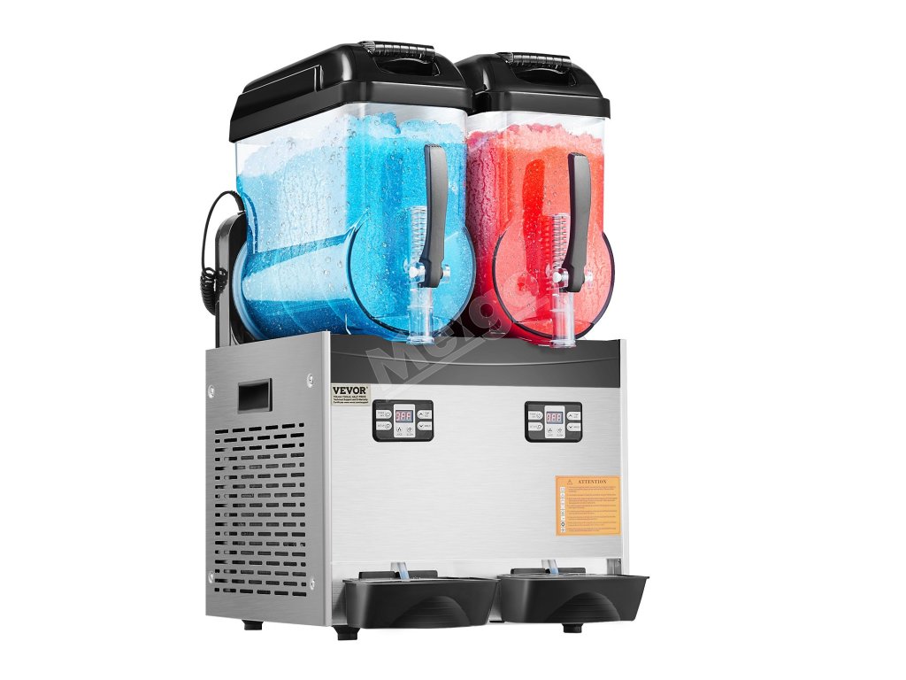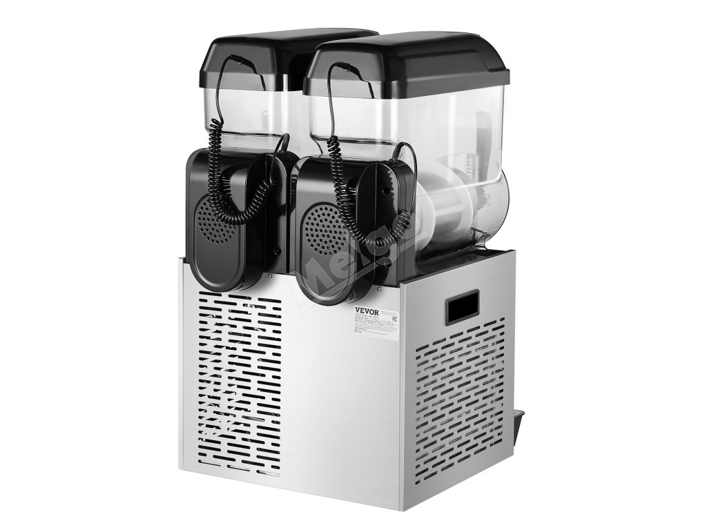 Tento komerčný prístroj na výrobu slushy má dve nádrže s objemom 12 l / 3,17 GAL, telo z nehrdzavejúcej ocele a nádrž z PC, ktoré ponúkajú odolné a zdravotne nezávadné materiály.