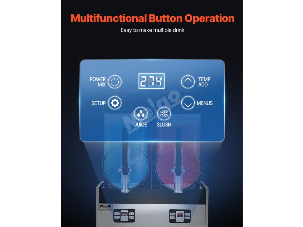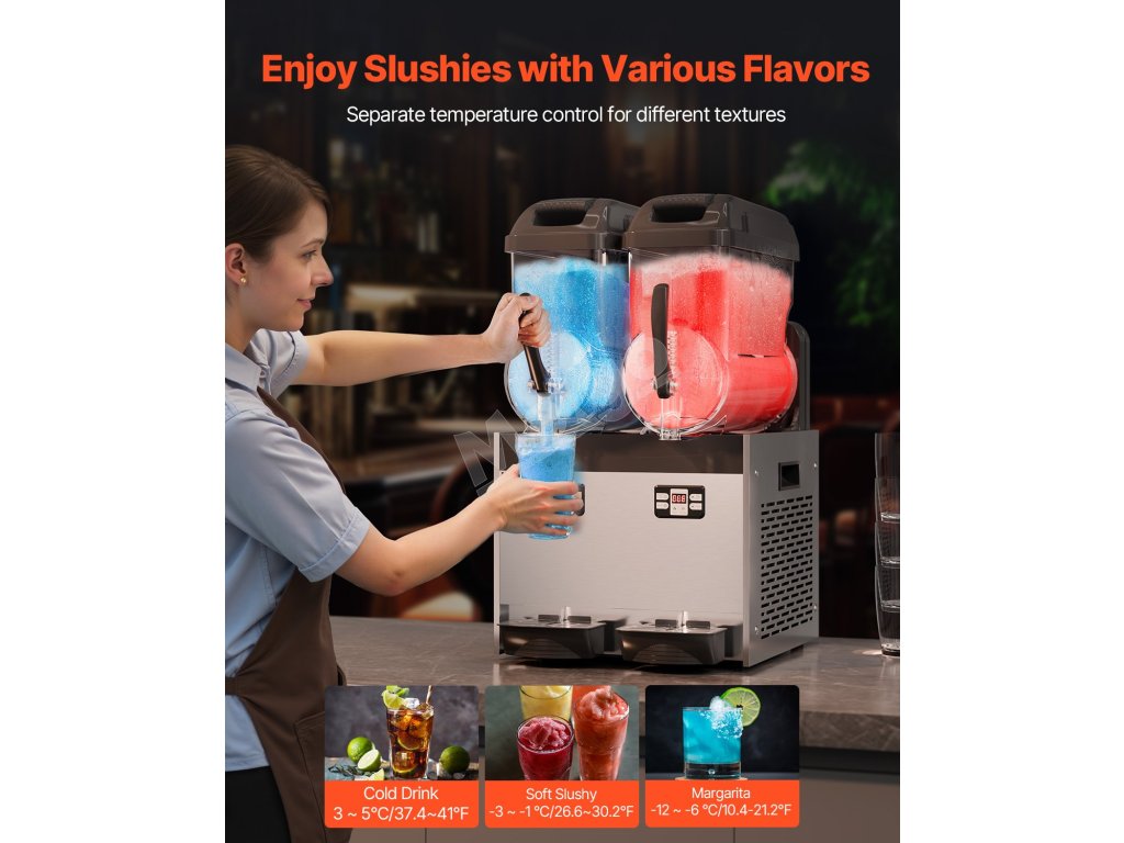 Vylepšený stroj na výrobu slushy poskytuje rozsah nastavenia teploty 5 ~ 59℉ / -15 ~ 15 ℃, takže je vhodný na prípravu rôznych nápojov vrátane džúsov, ľadovej kávy, čaju a dokonca aj margarity.