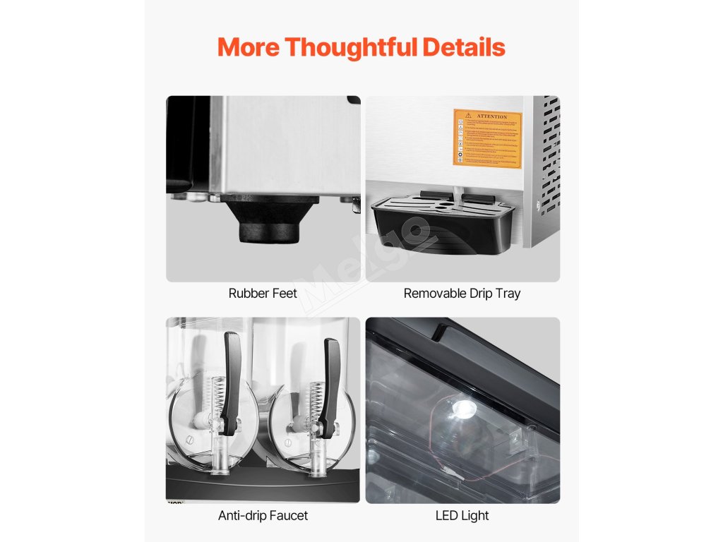 Tento komerčný prístroj na výrobu slushie je vybavený vysokokvalitným kompresorom a celomedeným kondenzátorom, vďaka čomu sa rýchlo ochladzuje, je energeticky účinný, pracuje stabilne a s nízkou hlučnosťou.