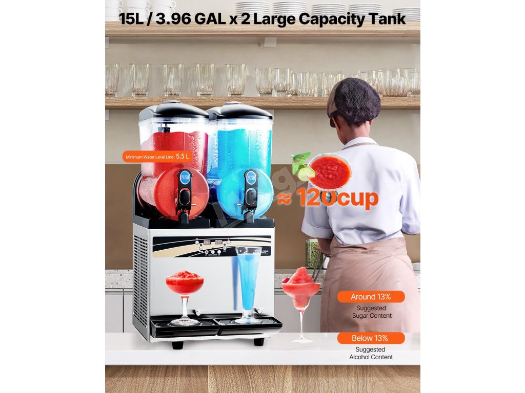 Stroj na mrazené nápoje 15L×2, nerezový, 120 pohárov, dvojitá nádrž