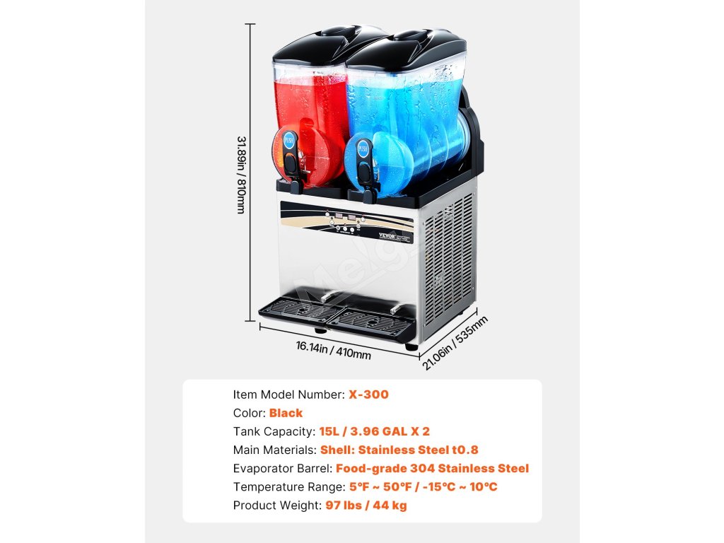 Tento komerčný stroj na výrobu ľadovej triešte má dve nádrže s objemom 15 l a nádrž z nehrdzavejúcej ocele a PC, ktoré ponúkajú odolné a zdravotne nezávadné materiály.
